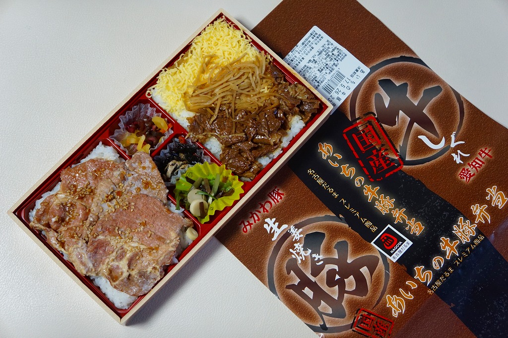 2015(平成27)年9月12〜24日にナゴヤドームのプロ野球中日ドラゴンズ戦で販売。以後は限定的かつ断続的に、スーパーの駅弁大会や名古屋駅で売られる模様。長方形の容器の右側で、白飯を愛知牛しぐれ煮ときんぴらごぼうと錦糸卵で覆い、左側で白飯をみかわ豚生姜焼きで覆い、ひじき、山菜、漬物で仕切る。中身の見た目と味で、肉質の悪さと業務用冷凍食品の多用で、これはがっかり。2017年までの販売か。