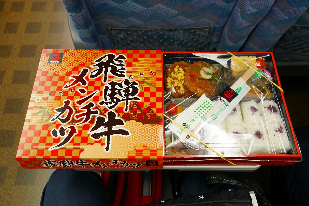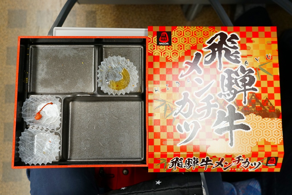2017(平成29)年の発売か。名古屋駅弁らしい大きな容器に、飛騨牛のメンチカツ2枚、俵型の型押し飯、玉子焼、山菜、カボチャやタケノコなどの煮物、守口漬と柴漬けとハリハリ漬け、黄桃とチェリーを詰める。メインのメンチカツはまるで工業製品のように身が詰まり形が整い、白飯の型押しもプレス機械の製品のよう。冷蔵での販売であり、品質でなく味わいの点では疑問を感じた。2019年頃までの販売か。
