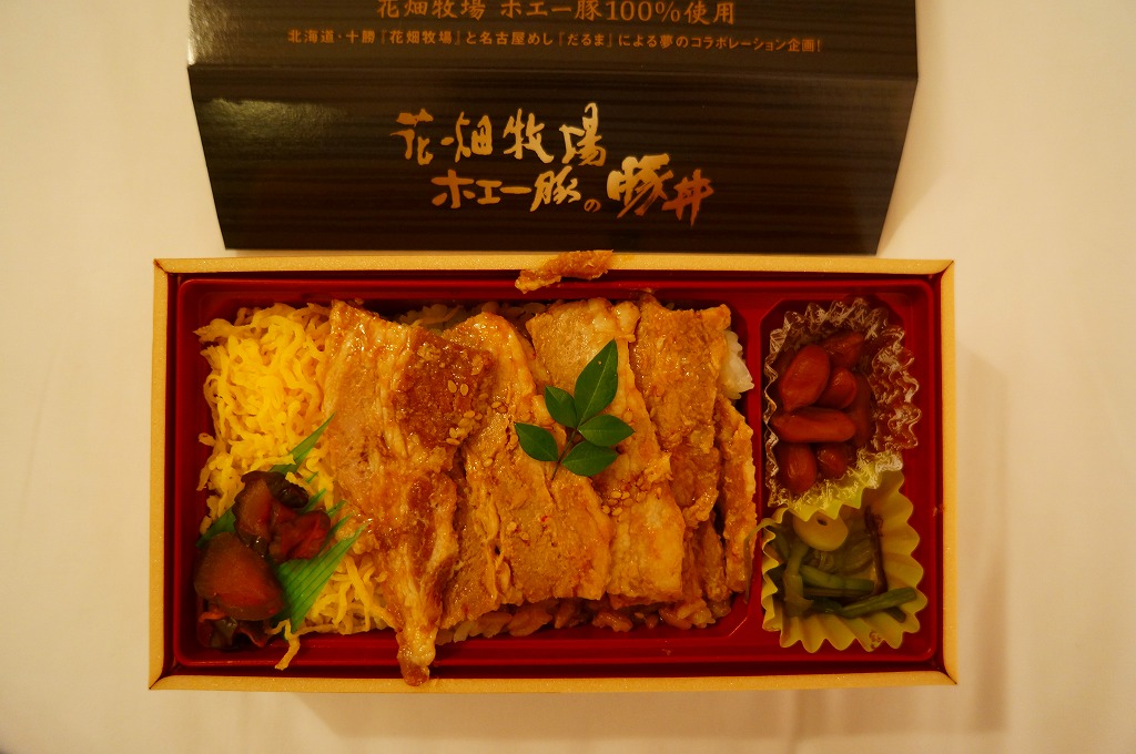 2011(平成23)年6月22日に中部国際空港で、メディア上で暴れる花畑牧場と名古屋の駅弁屋でもある調製元との「コラボ商品」として発売。赤いプラ製トレーを接着した長方形の容器に透明なふたをして、商品名を書いた黒いボール紙の枠にはめる。中身は白御飯の上を豚焼肉と錦糸卵で覆い、山菜醤油漬と落花生煮と柴漬けを添えるもの。