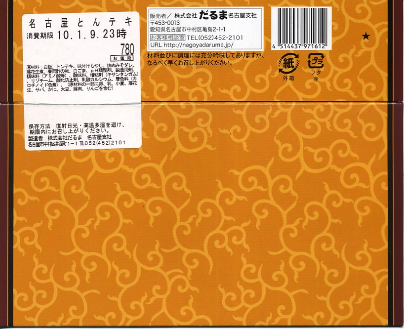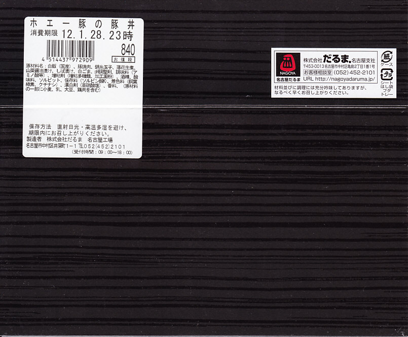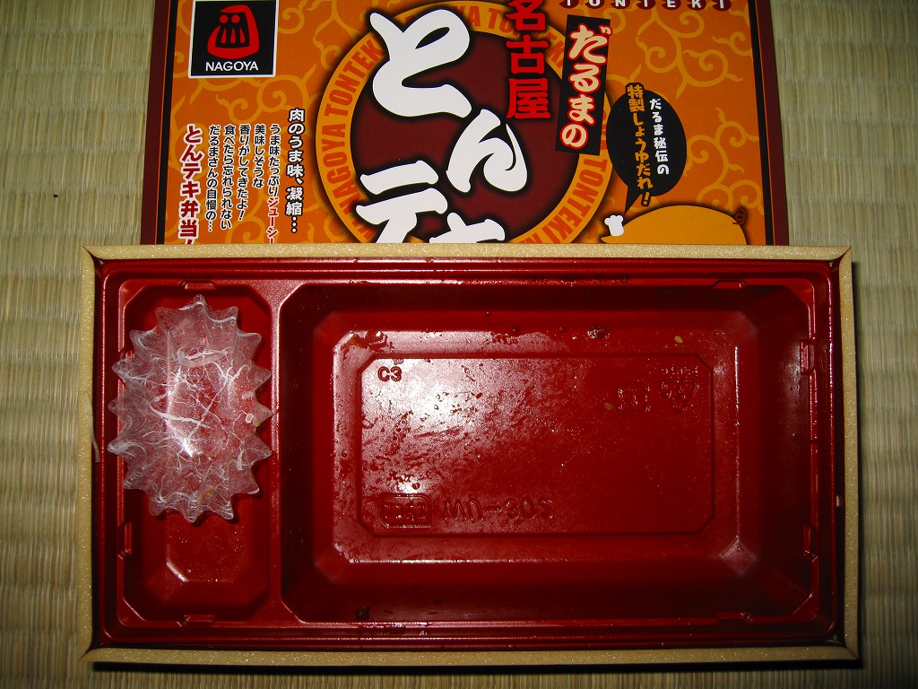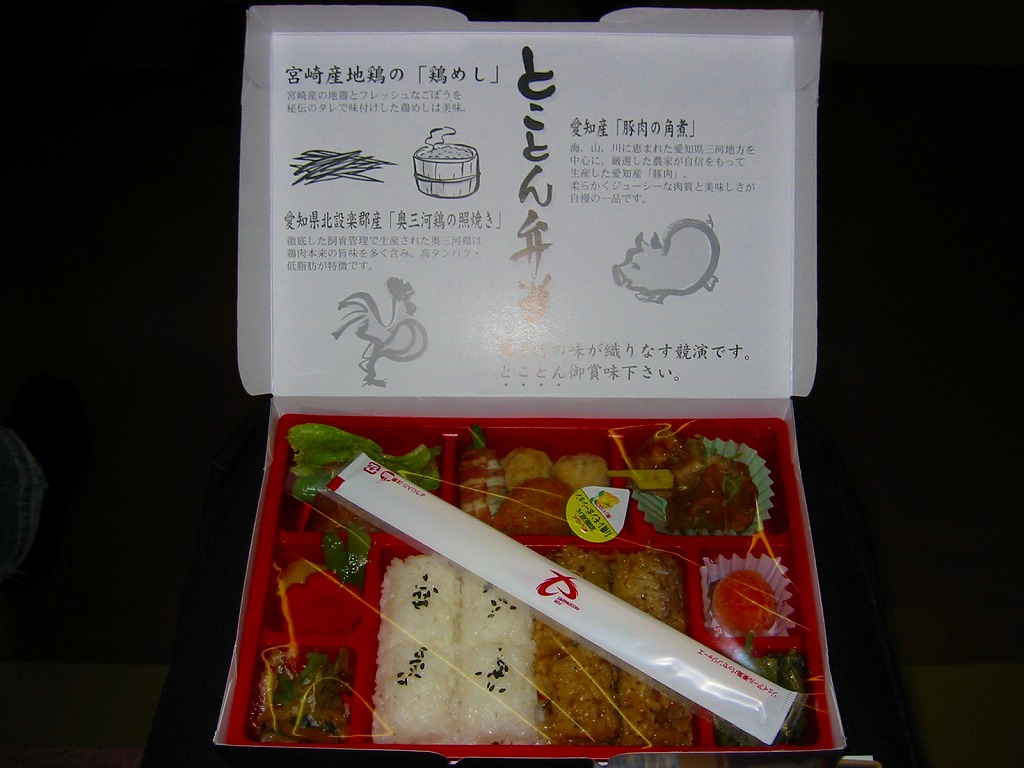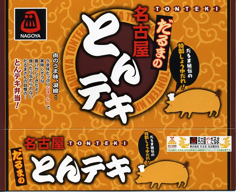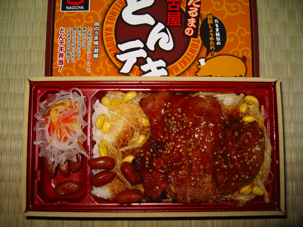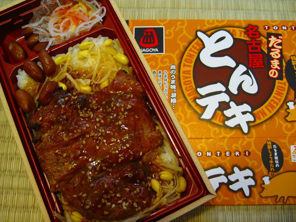 2009(平成21)年の秋までに発売か。長方形の容器に透明なふたをして、商品名を書いたボール紙の枠にはめる。中身は白御飯の上にもやし炒めを敷き、「とんテキ」なる豚焼肉を載せて、落花生煮と春雨酢の物を添えるもの。味噌カツだらけの名古屋駅弁の中で、珍しい醤油系のたれをまとう豚肉駅弁。固く歯応えのある豚肉も、全国各地で柔らかさを競う昨今としては珍しい感じ。価格は2010年の購入時で780円、2014年4月の消費税率改定で800円。2015年までの販売か。