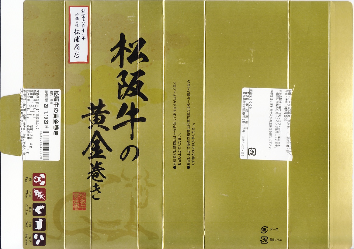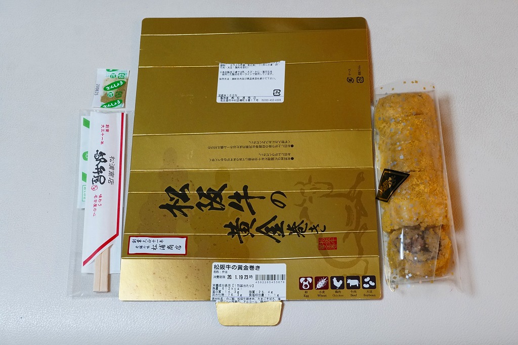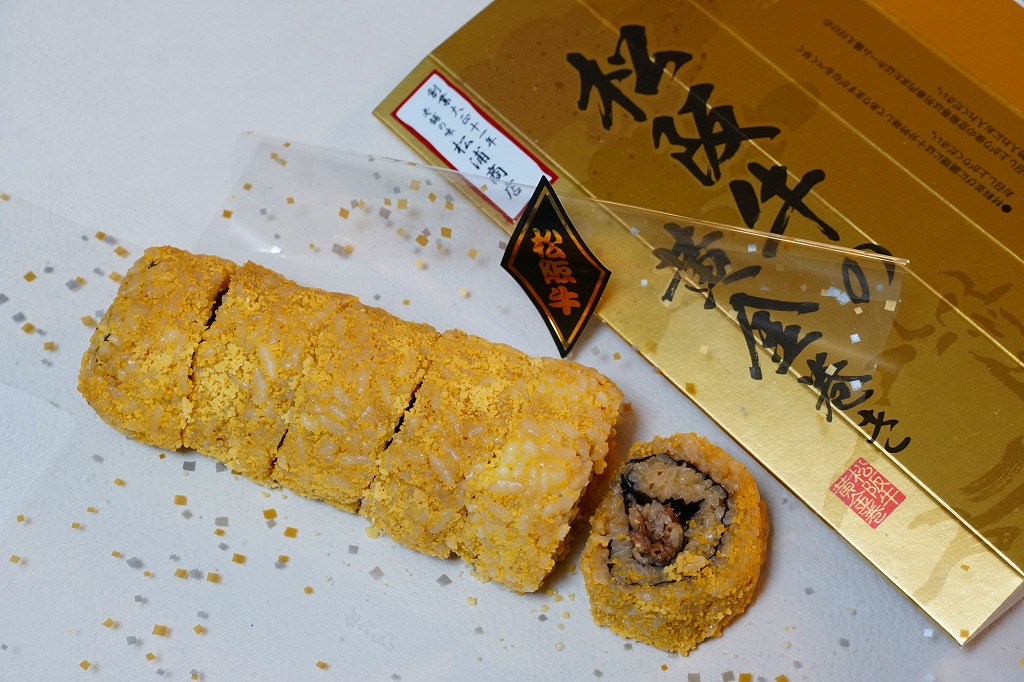 2018(平成30)年7月に発売。松阪牛の焼肉を芯に、タレ御飯と海苔を二重に巻き、玉子そぼろをまとわせた細身の太巻きが1本、金銀のフィルムに巻かれて金色の紙容器に収められる。飯も肉も玉子も、なかなか甘い味付け。類例を思い当たらない不思議な商品に思えた。価格は2018年の発売時で1,000円、2020年の購入時で1,080円、2022年時点で1,100円、2023年時点で1,150円。2024年までの販売か。