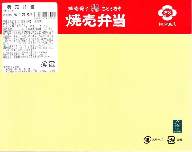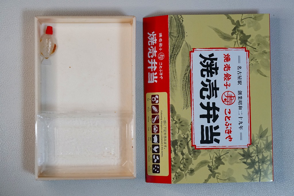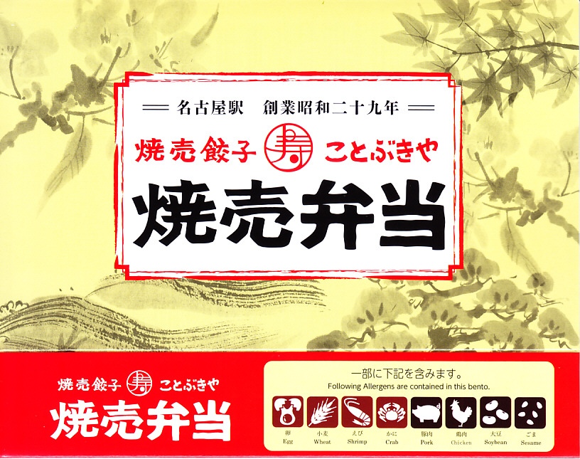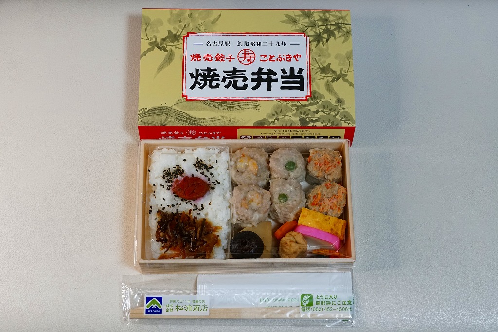2020(令和2)年12月に名古屋駅で発売。1954年に名古屋で創業し、名古屋駅前の百貨店で焼売や餃子を販売した寿屋を名乗る焼売弁当。同社が2019年に名古屋駅弁の松浦商店の子会社へ事業譲渡されたことで、この弁当が名古屋駅に誕生したという。長方形の容器に、生姜昆布を載せた日の丸御飯を詰め、惣菜としては通常サイズ、駅弁としては大きめなえび焼売、焼売、かに焼売を2個ずつ入れ、かまぼこ、玉子焼、煮物、醤油と辛子を添える。白い肉と皮の球に手作り感のある弾力があり、弁当の姿と内容を持ちながら焼売のみの惣菜を食べている感じ。この調子で餃子の弁当も見てみたい。2024年春頃までの販売か。