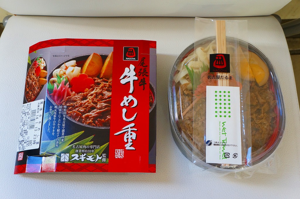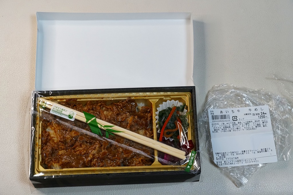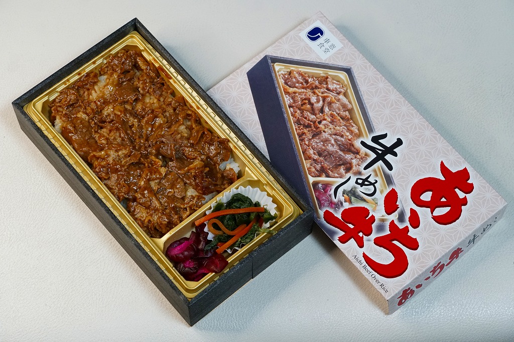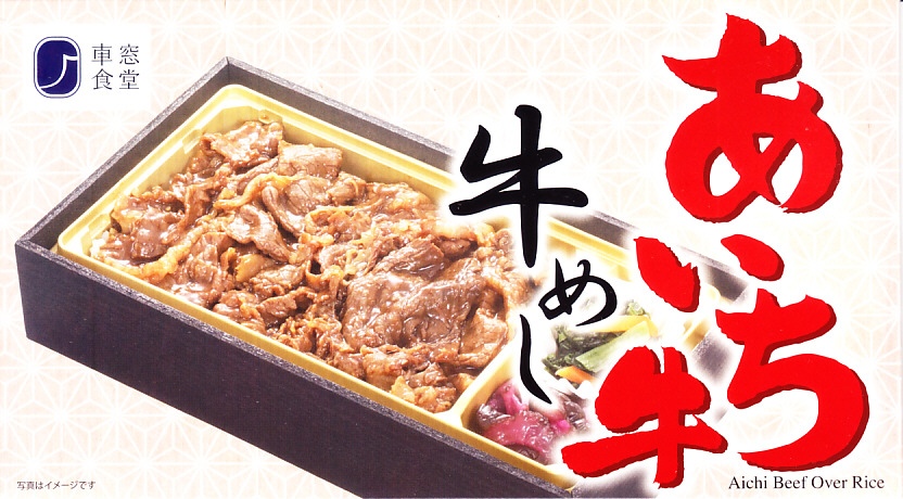 2017(平成29)年11月に名古屋駅で発売。長方形のプラ容器に白飯を詰め、牛肉煮で覆い、青菜としば漬けを添える、日本全国の牛肉駅弁に共通のつくり。タレの多さが個性か。醤油ベースで煮込んだ、やわらかな肉質の愛知県産「あいち牛」を使うそうな。価格は2017年の発売時で1,100円、2022年時点で1,140円、2023年時点で1,200円、9月の購入時で1,250円、2025年時点で1,450円。