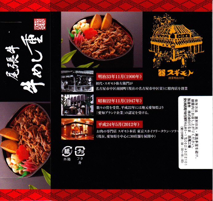 尾張牛とは、杉本食肉産業株式会社が2006年から商標を持つ愛知県産の牛肉。だからこの駅弁には「お肉の専門店スギモト」のマークがパッケージに記される。