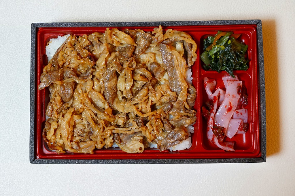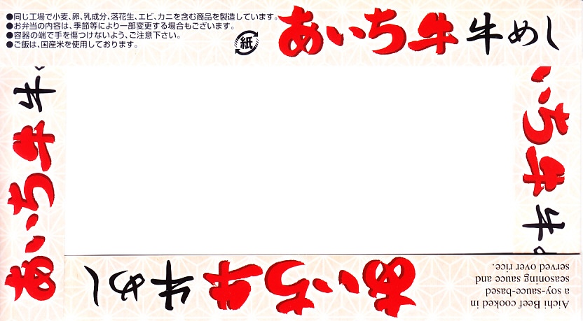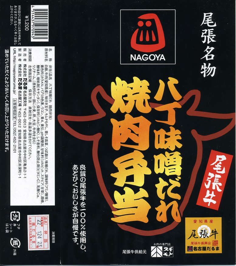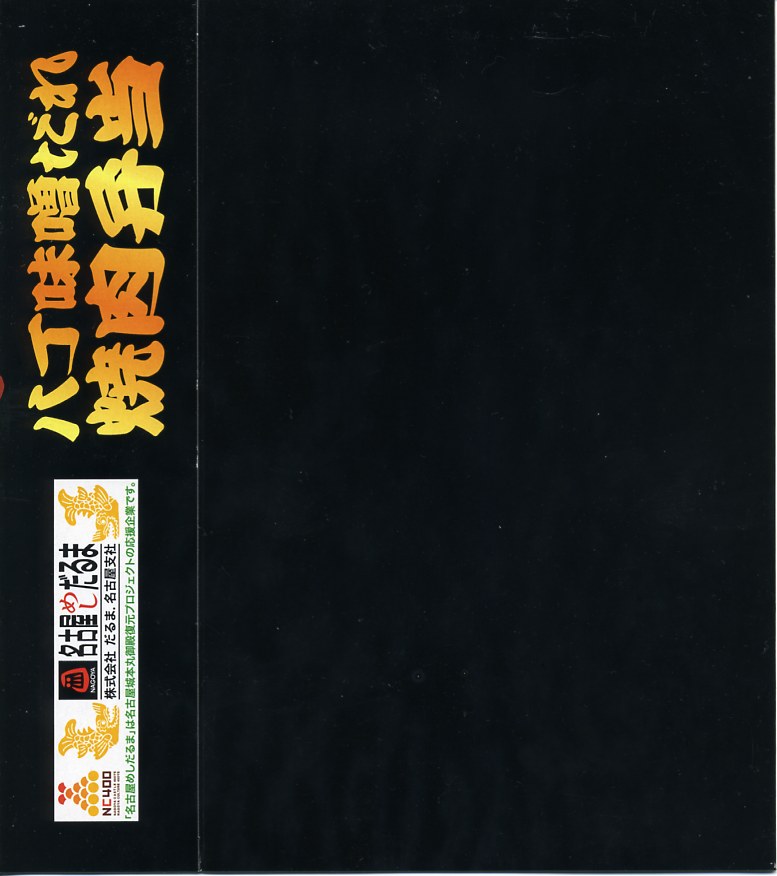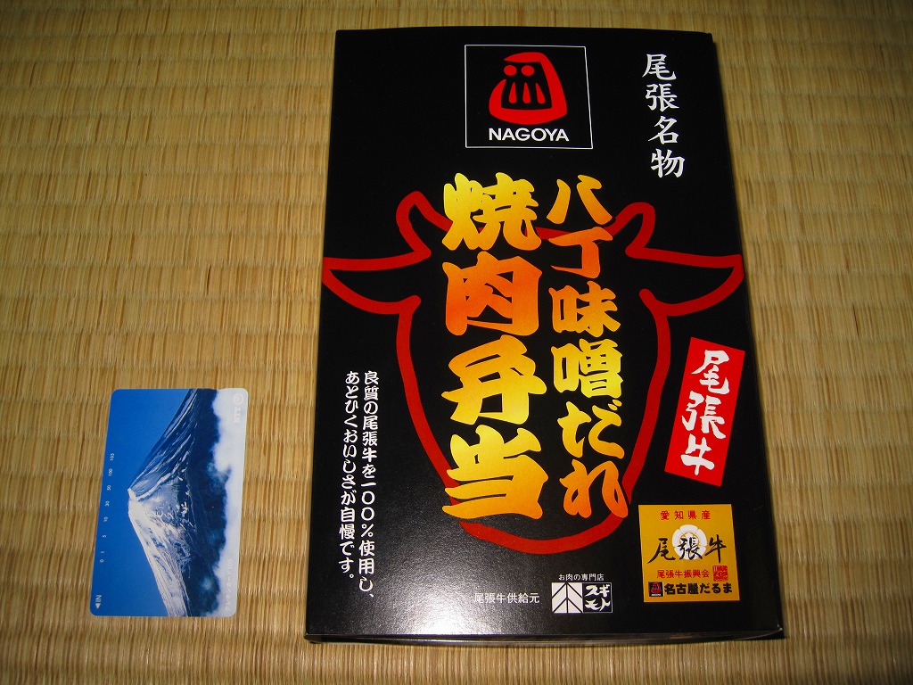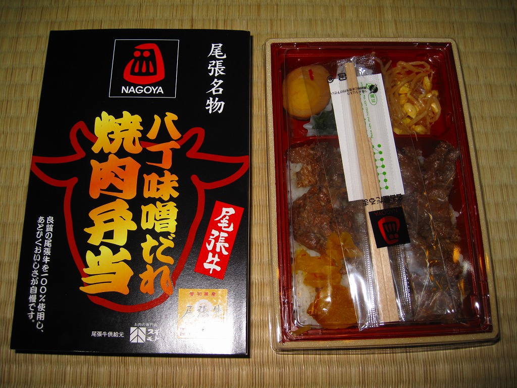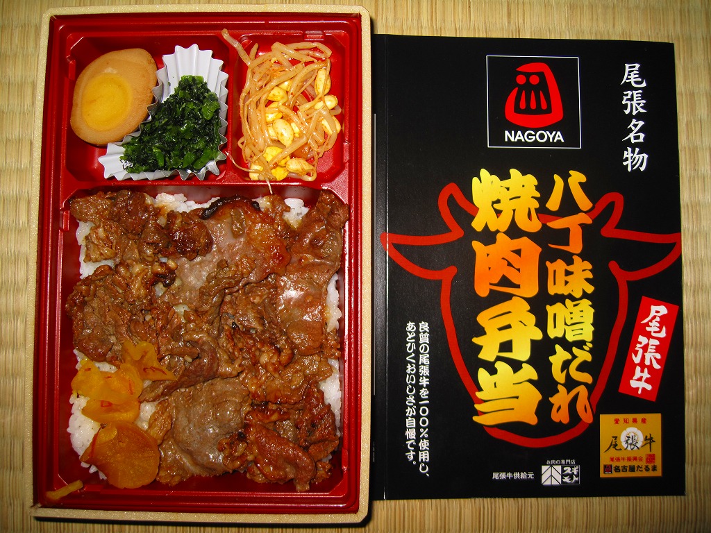2006(平成18)年の春頃に発売か。ちょっと大きめな長方形の容器に透明なふたをして、商品名をしっかり書いた黒いボール紙の枠にはめる。中身は白御飯の上に味噌だれを絡めた尾張牛の焼肉を貼り付け、煮玉子半分、キムチもやし、青しそ高菜、つぼ漬けを添えるもの。2011年頃までの販売か。