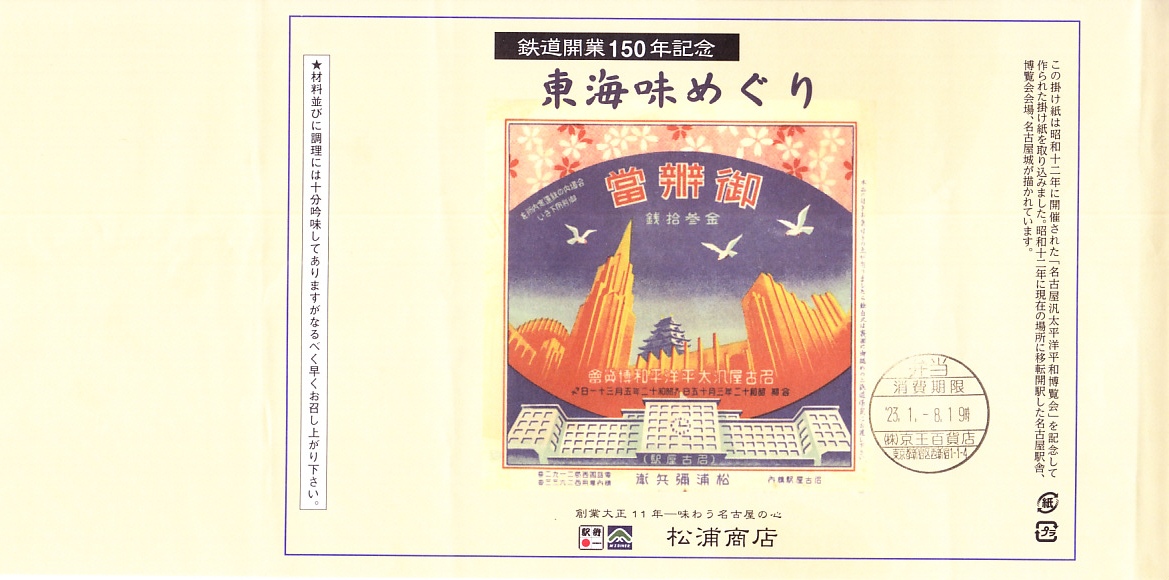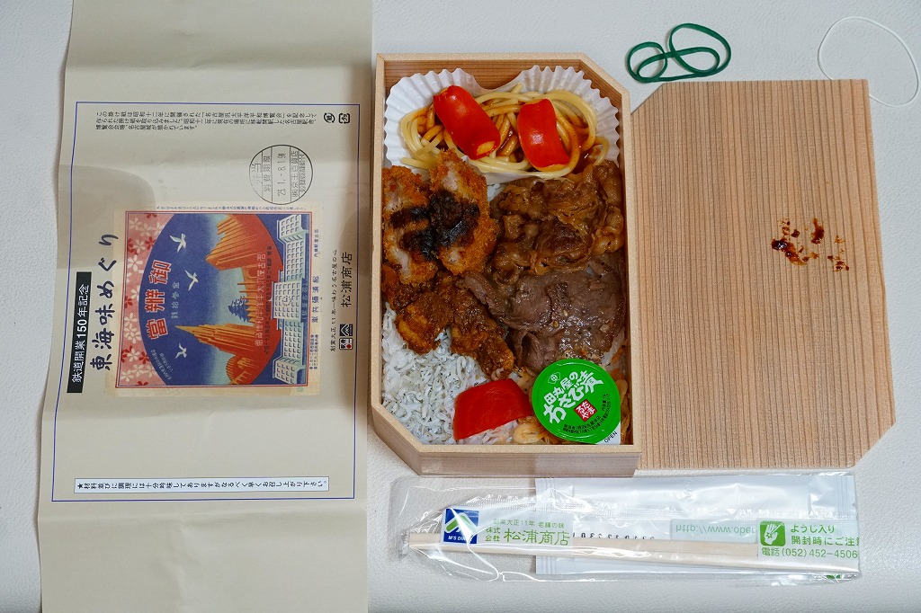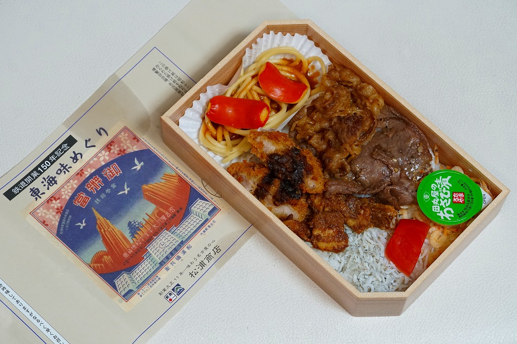 掛紙には1937(昭和12)年の名古屋汎太平洋平和博覧会の記念掛紙の絵柄を取り込んだ。名古屋駅の幕の内駅弁より小柄な容器に白飯を詰め、しらす、桜えび、豚ステーキ、みそカツ、松阪牛焼肉、飛騨牛焼肉で覆い、スパゲティとウインナーを添え、赤かぶらとわさび漬カップも入れる。東海地方の静岡県と岐阜県と愛知県の名物を盛り付けたという。肉が高価なのだろうが、それにしても高額な弁当。