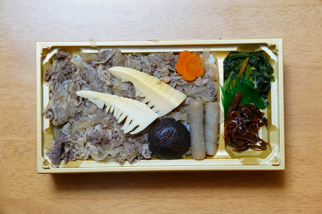 2016(平成28)年の発売か。白飯を牛焼肉で覆い、こんにゃくの梅和えとワサビ菜お浸しを添える、シンプルな牛丼。名古屋駅の松阪牛駅弁でブランド牛を思わせる風味や品質を備えたものに当たったことがなく、今回も同じ印象。ごくごく並の牛肉駅弁だった。価格は2016年の発売時で1,300円、2020年の購入時で1,340円、2022年時点で1,390円、2023年時点で1,480円、2024年時点で1,490円、2025年時点で1,530円。