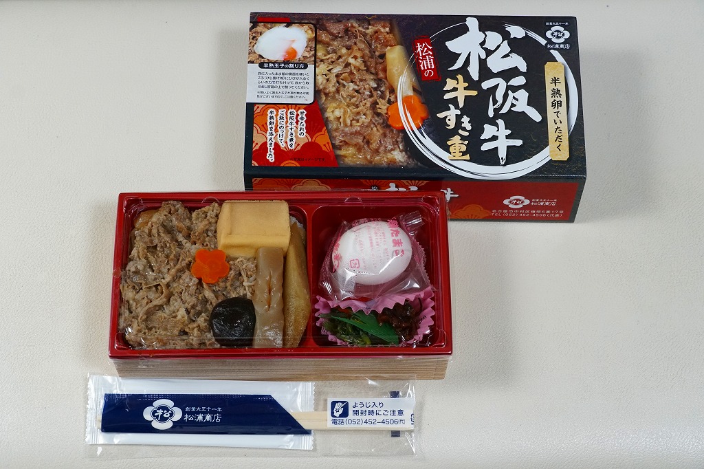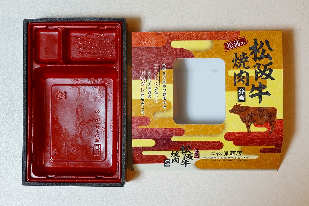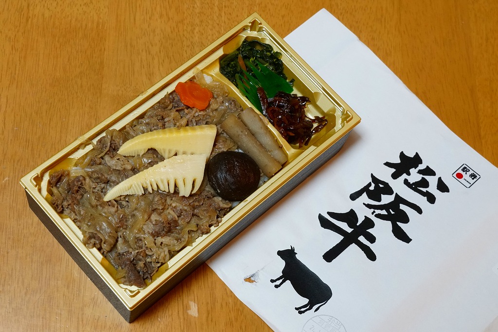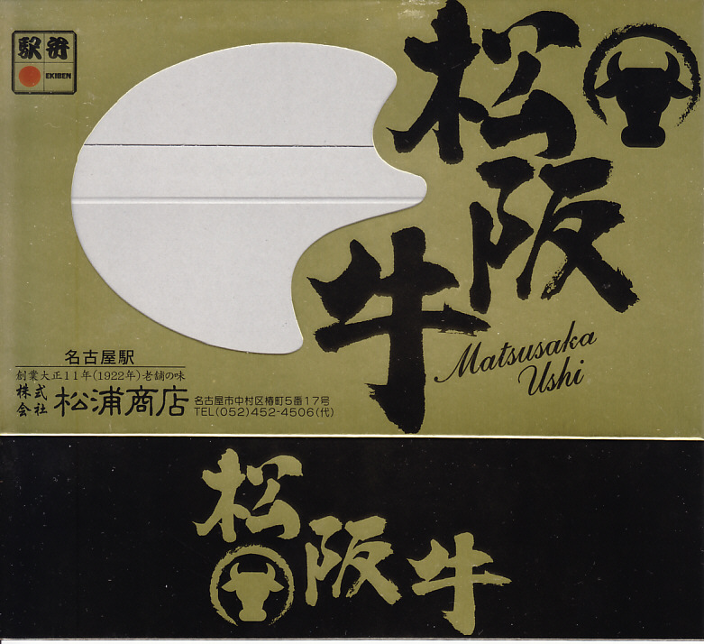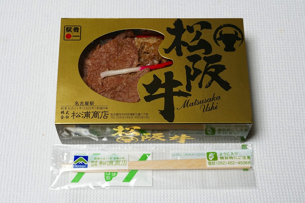 2012(平成24)年の秋までに発売。白御飯を牛肉煮で薄く覆い、タケノコとシイタケとゴボウとニンジンの煮物で彩り、玉子焼、かまぼこ、生姜昆布、わさび菜おひたしを添える。本来は玉子焼でなく半熟卵が入るようで、駅弁大会への輸送対応でこうなったのだろう。そんな輸送販売の影響か、少量の牛肉の脂が白く固くなり飯に浸み、ブランド牛の味がどこかに行ってしまっていた。なぜ名古屋駅で松阪牛なのかという疑問を感じさせながら、JR名古屋駅と近鉄名古屋駅での販売が続く。価格は2012年の発売時や2015年の購入時で1,100円、2016年時点で1,200円、2018年時点で1,250円、2019年8月から1,280円、2021年時点で1,340円、2022年時点で1,390円、2023年時点で1,480円。2024年秋頃までの販売か。