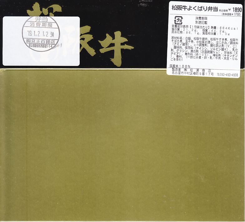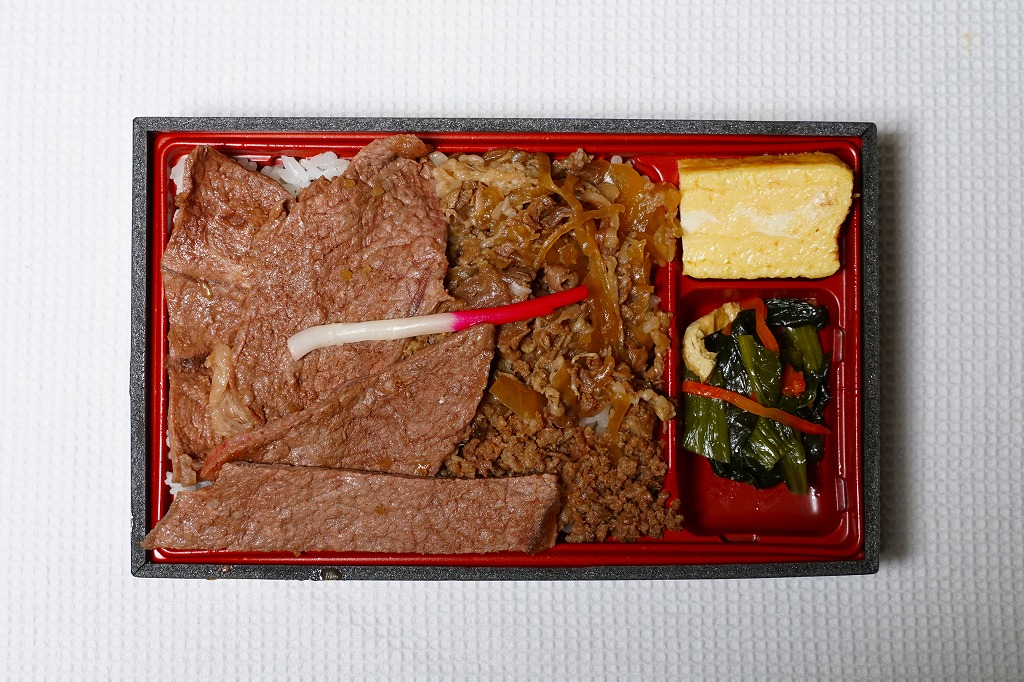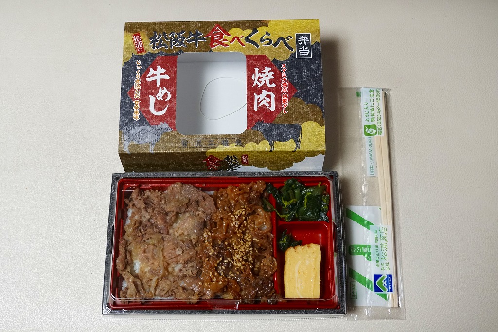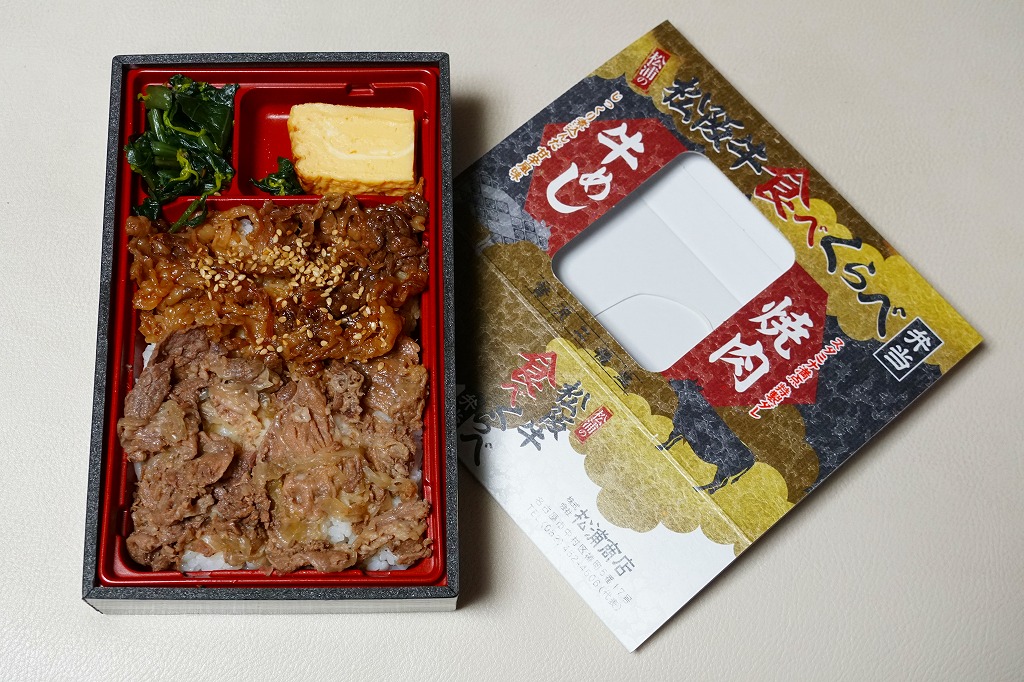2019(平成31)年1月の京王百貨店の駅弁大会で実演販売。白御飯を牛焼肉と牛肉煮と牛そぼろで覆い、小松菜お浸しと玉子焼を添える。これらの肉が松阪牛ということでこんな高価になったが、食べればブランド牛でなく外国産の赤身牛のような味で、催事場では集客に苦戦していたように見えた。ブランド牛を意識しなければ、赤身が柔らかくおいしい牛肉弁当だった。