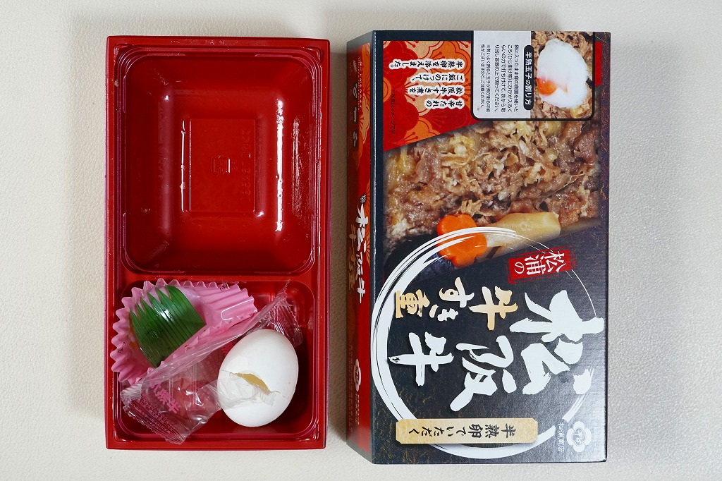 2024(令和6)年の秋までに、従前の駅弁「松阪牛めし」を置き換えか。長方形のプラ容器に白飯を少し詰め、甘辛たれの松阪牛すき煮として、牛肉煮と玉ねぎ煮、高野豆腐、にんじん、しいたけ、ごぼうで覆い、半熟玉子とわさび菜を添える。たしかに見比べれば、前作からタケノコとかまぼこを抜いて高野豆腐を入れた感じで、お肉の身と味を引き伸ばしたような感じも似る。駅弁売店で良い肉の弁当を手軽に買える意味で、この存在はありだと思う。価格は2024年の発売時で1,490円、2025年の購入時で1,550円。