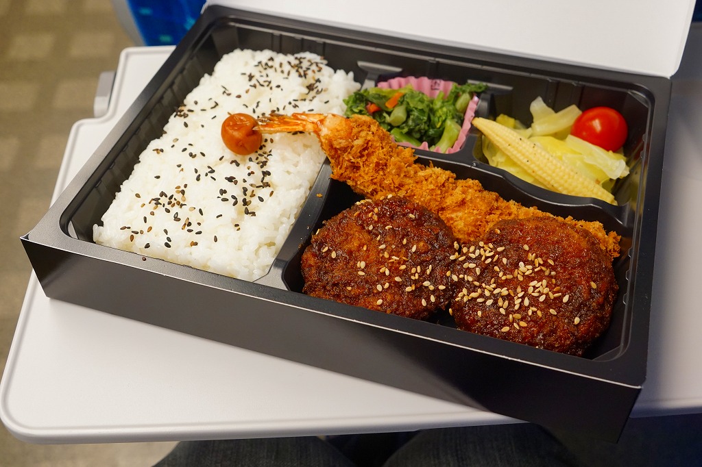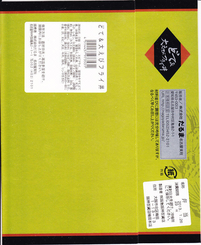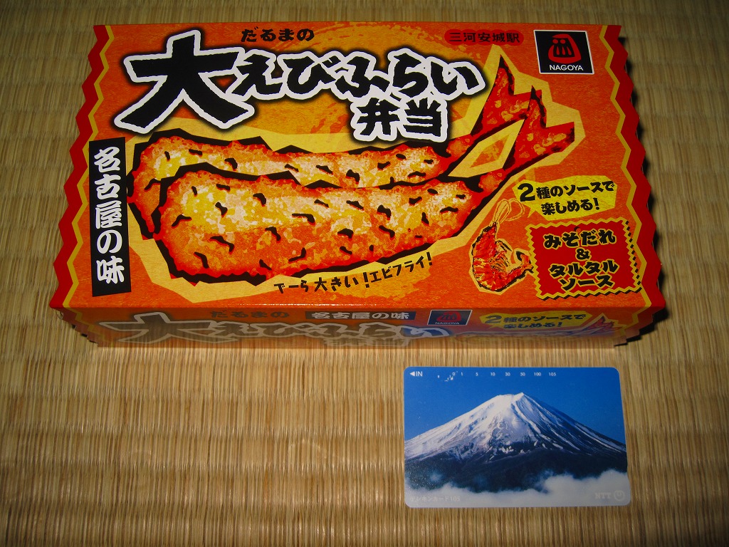 エビフライは確かに大きく、衣で増量せず身での大きさがある。「びっくりみそかつ」に続きインパクトのある商品が誕生した感じ。パッケージには「三河安城駅」の表記が見えるが、現地ではこれからどこでどのように販売されるのだろうか。価格は2011年の購入時で1,100円、2014年時点で1,220円、2019年時点で1,130円。2019年頃までの販売か。