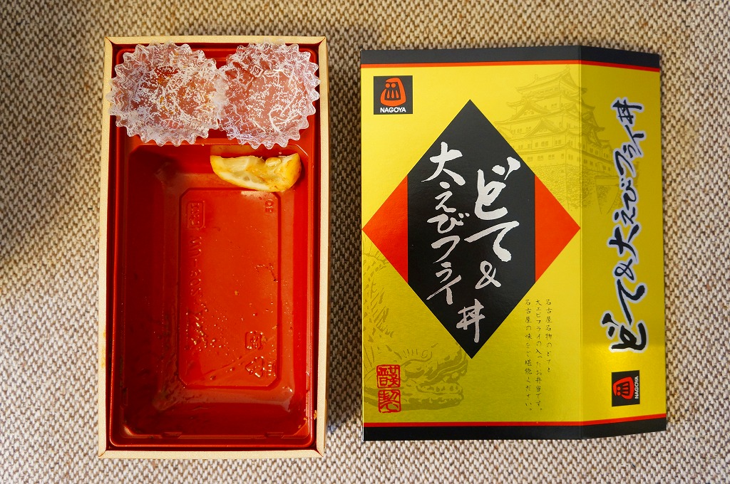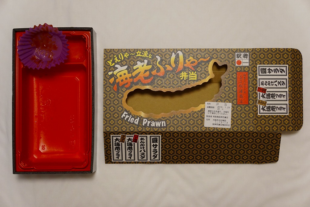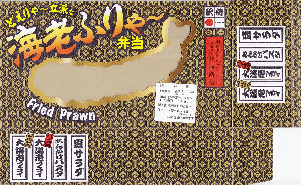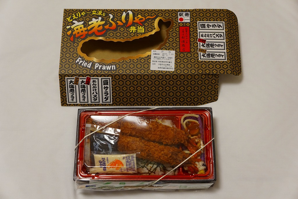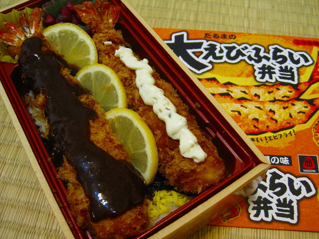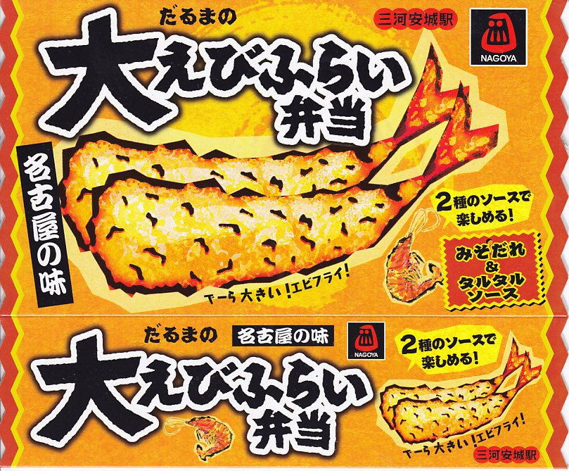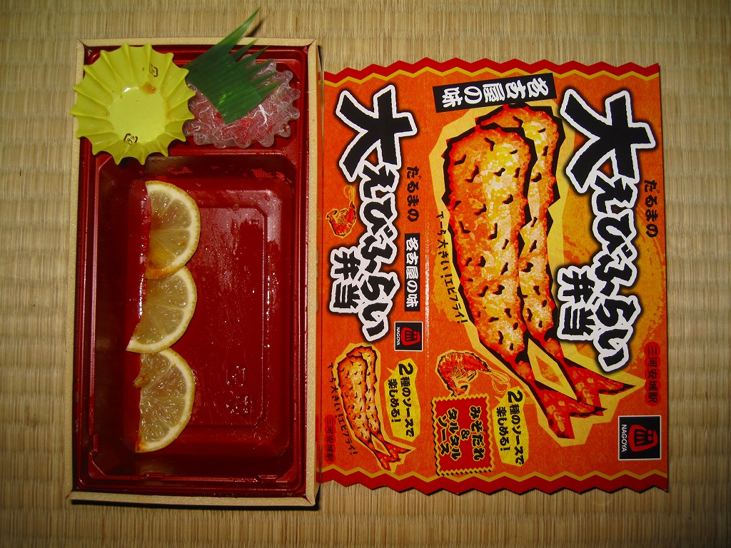 2011(平成23)年1月の京王百貨店の駅弁大会での実演販売で発売か。長方形の容器に透明なふたをして、駅弁の名前とエビフライを大きく書いたボール紙の枠にはめる。中身は御飯の上に錦糸卵と刻み海苔を敷き、確かに大きなエビフライを2本横たえて、レモンのスライス、落花生煮、昆布佃煮、守口漬を添えるもの。八丁味噌だれとタルタルソースを袋で別添する。