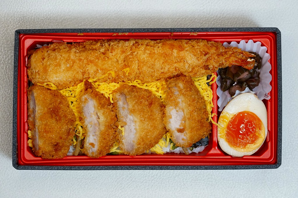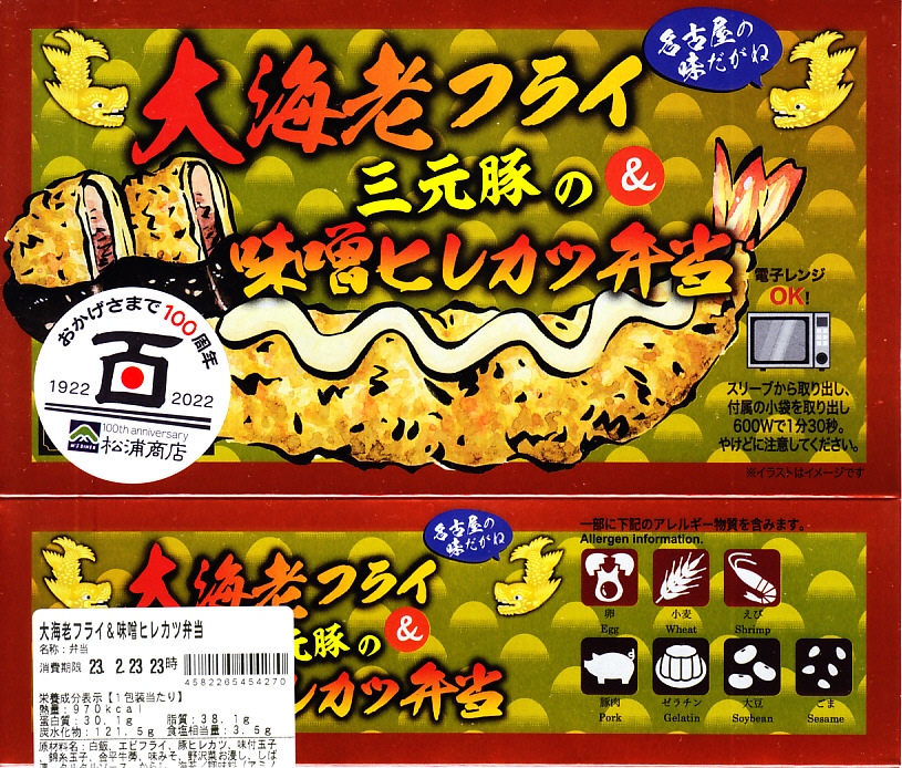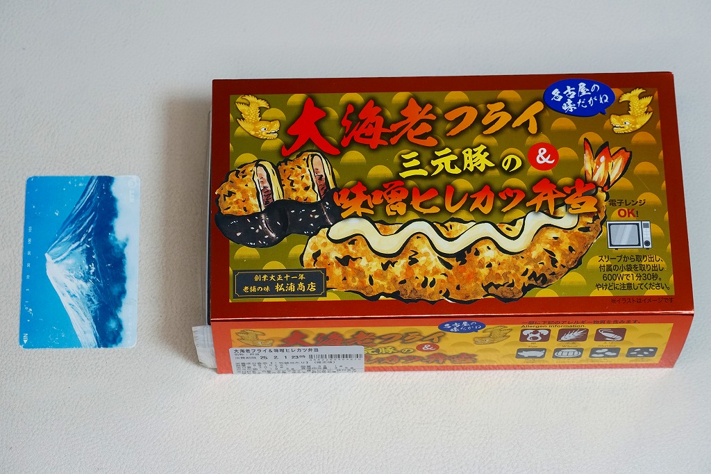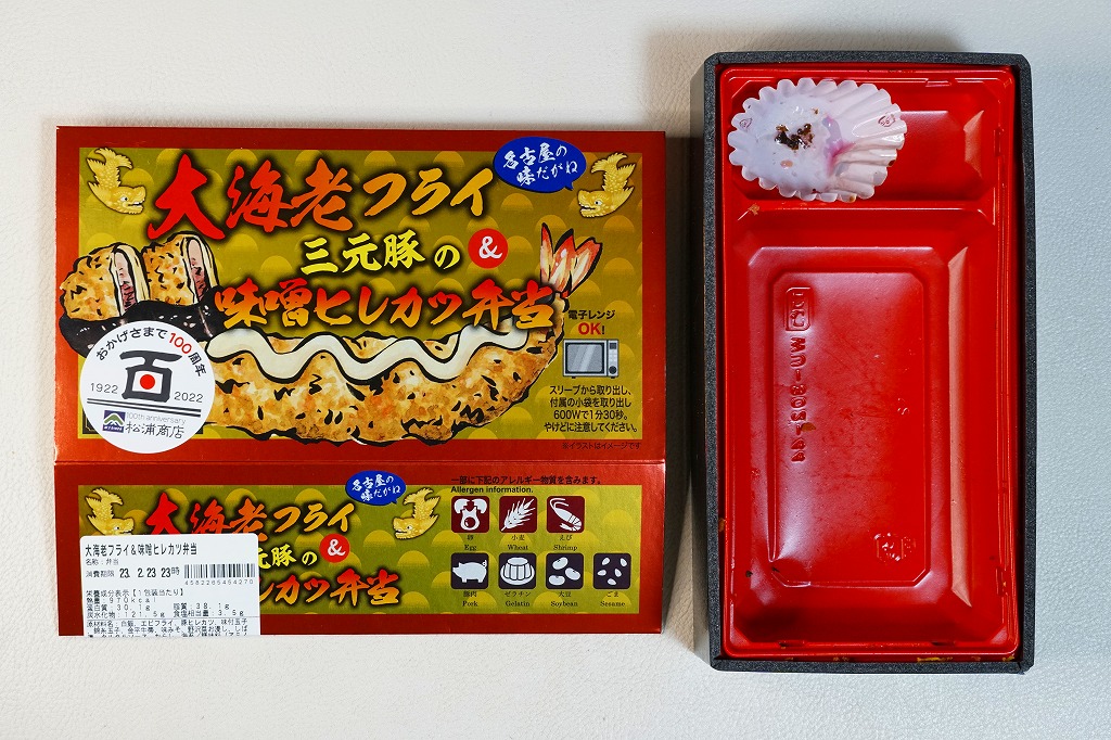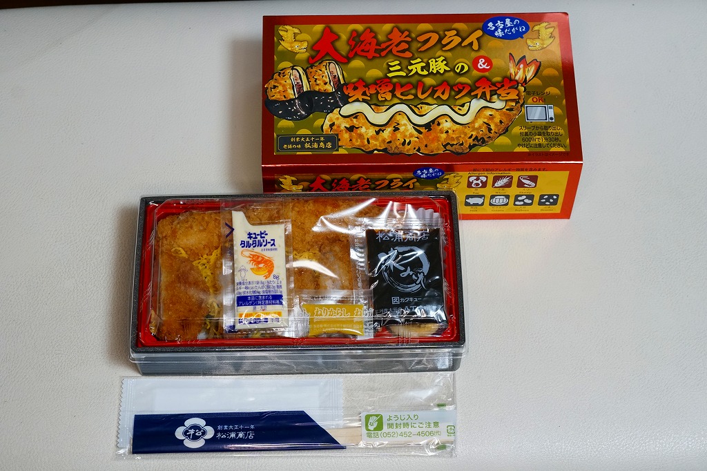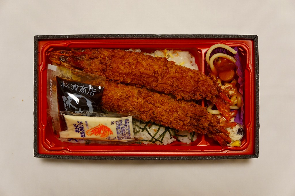 2021(令和3)年10月に東京都の京王百貨店の地下食品売り場で発売か。2022年に東京駅の駅弁売店「駅弁屋 祭」で売られたり、2023年1月の京王百貨店の駅弁大会で売られたり、収穫報告は東京ばかりで、名古屋駅で買えるか分からない。長方形のプラ容器に白飯を詰め、海苔と錦糸卵で覆い、エビフライと豚ヒレカツできれいに覆い、味付玉子と柴漬けを添え、味みそとタルタルソースの袋を添付。ど派手なスリーブも大えびふらいの内容も、名古屋駅ではこの松浦商店でなくだるまの駅弁のよう。調味料を使わずこのまま食べれば、意外に軽く爽やかな味。価格は2023年の購入時で1,200円、2025年の購入時で1,360円。