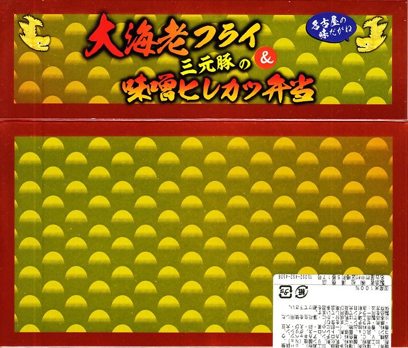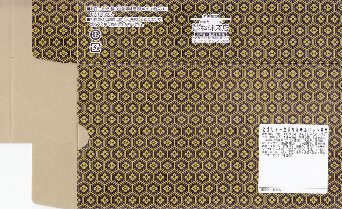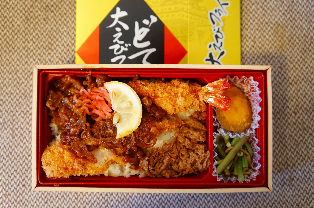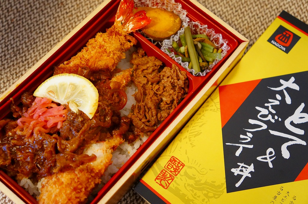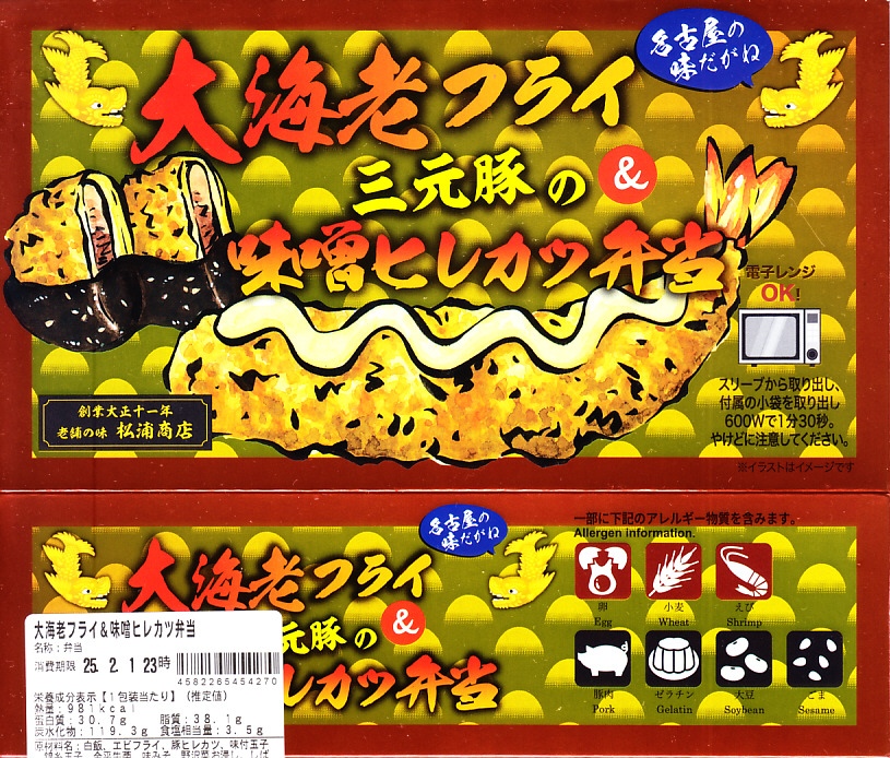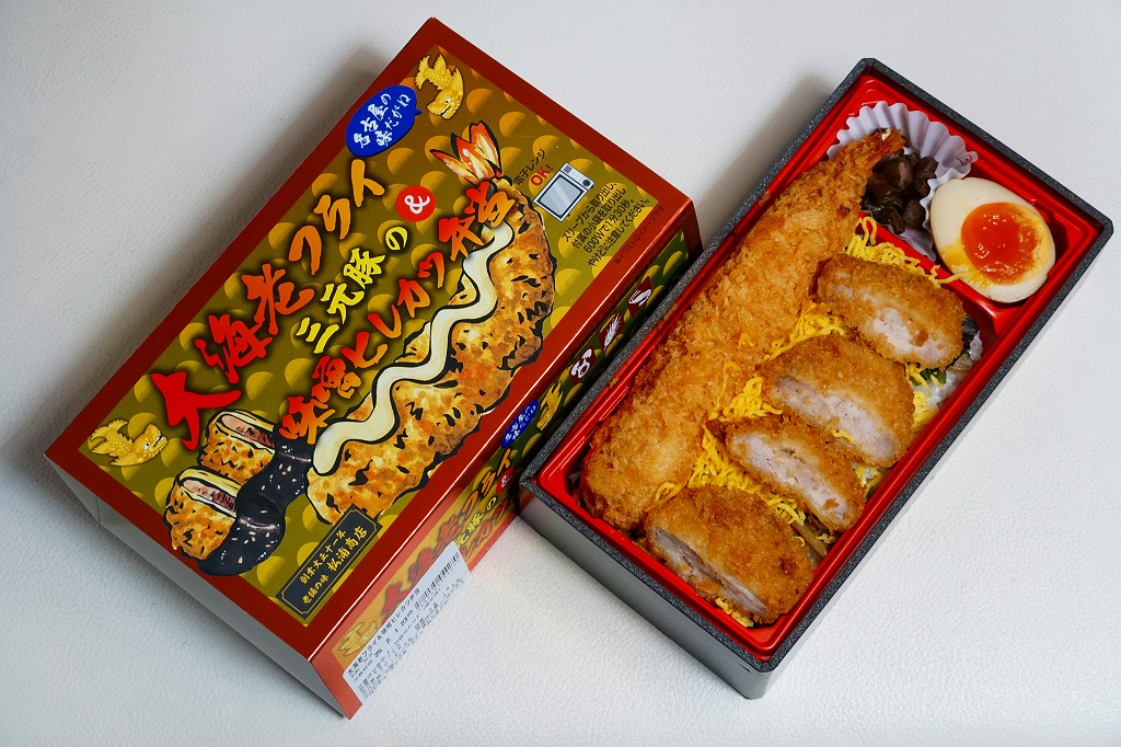 2021(令和3)年10月に東京都の京王百貨店の地下食品売り場で発売か。2022年に東京駅の駅弁売店「駅弁屋 祭」で売られたり、2023年1月の京王百貨店の駅弁大会で売られたり、収穫報告は東京ばかりで、名古屋駅で買えるか分からない。長方形のプラ容器に白飯を詰め、海苔と錦糸卵で覆い、エビフライと豚ヒレカツできれいに覆い、味付玉子と柴漬けを添え、味みそとタルタルソースの袋を添付。ど派手なスリーブも大えびふらいの内容も、名古屋駅ではこの松浦商店でなくだるまの駅弁のよう。調味料を使わずこのまま食べれば、意外に軽く爽やかな味。価格は2023年の購入時で1,200円、2025年の購入時で1,360円。