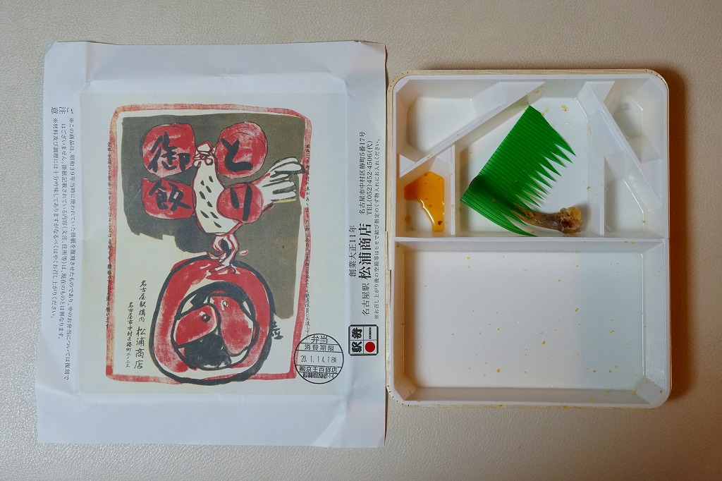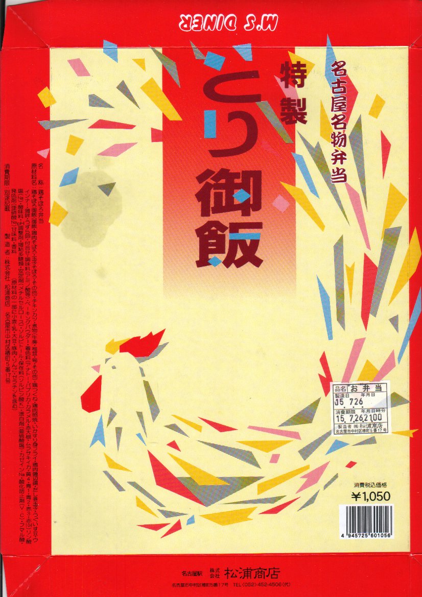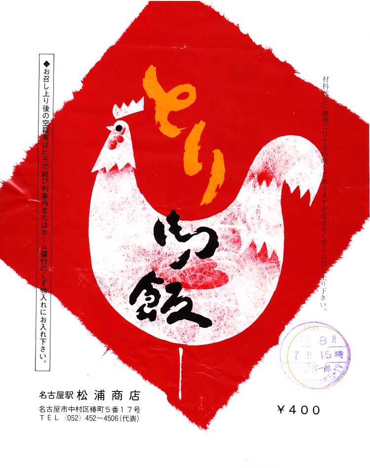 1980年代のものと思われる、昔の名古屋駅弁の掛紙。おそらく中身は現在の「特製とり御飯」の、おかず満載ではない普通版か。個人的にそういう商品が現代に復刻されることを願っている。