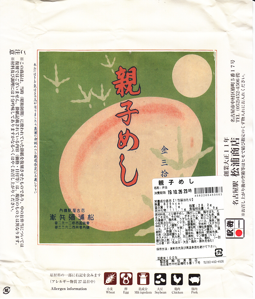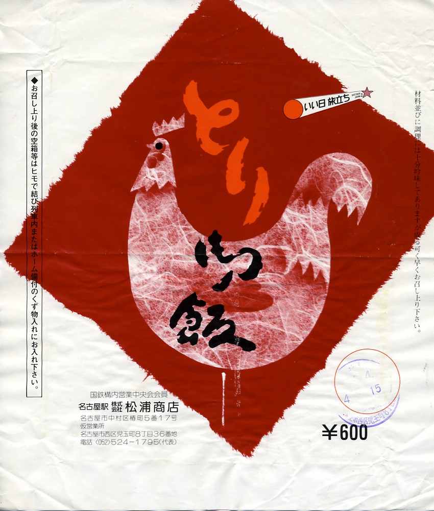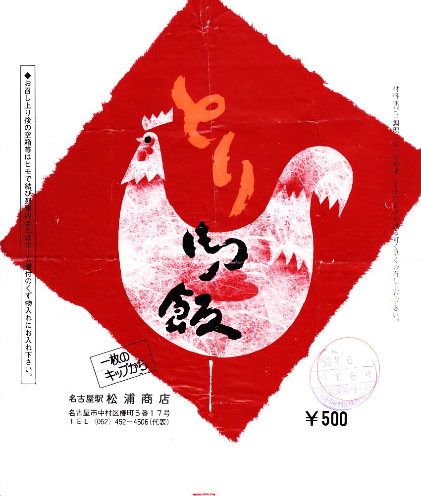 1978(昭和53)年6月18日6時の調製と思われる、昔の名古屋駅弁の掛紙。下記や上記のものと同じく、ニワトリが目立つ赤黒い絵柄。