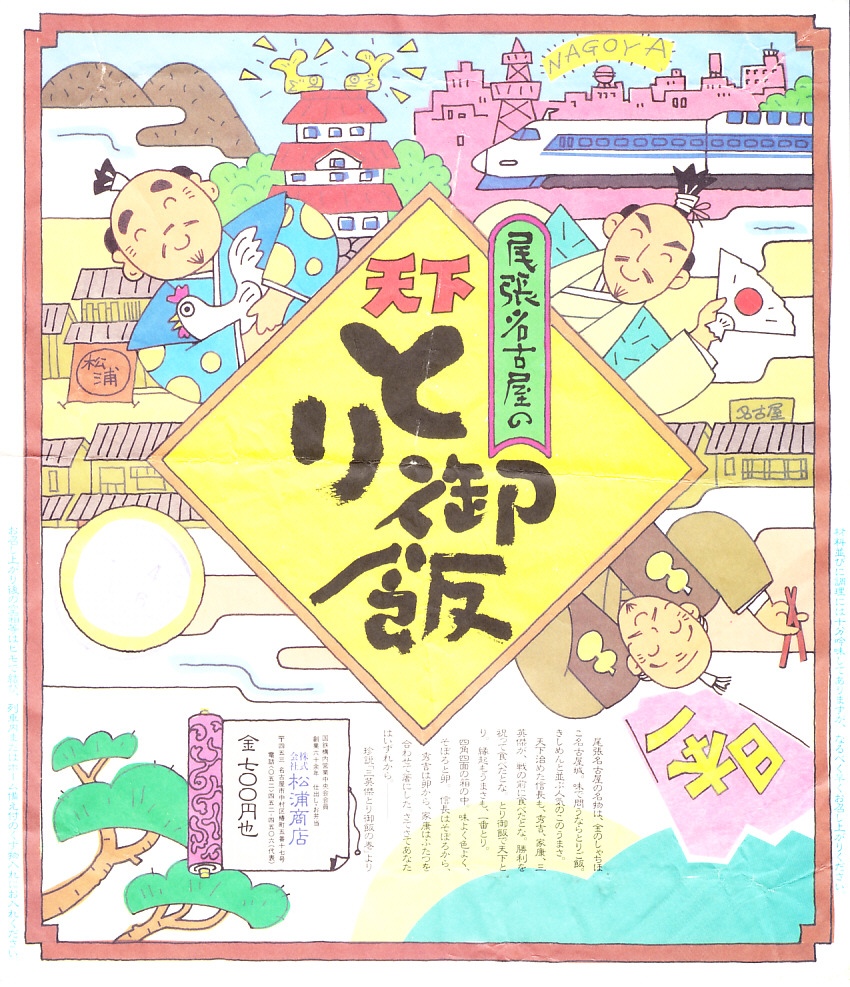 1987(昭和62)年4月25日の調製と思われる、昔の名古屋駅弁の掛紙。名古屋駅で伝統の駅弁「とり御飯」におかずを付けて1986年頃に発売、1990年代に「特製とり御飯」に改称し、2016年に再び「天下とり御飯」となった。尾張名古屋をめでたく賑やかに描いたようなマンガ絵で、新幹線は当時まだ7編成しかなかった100系電車。