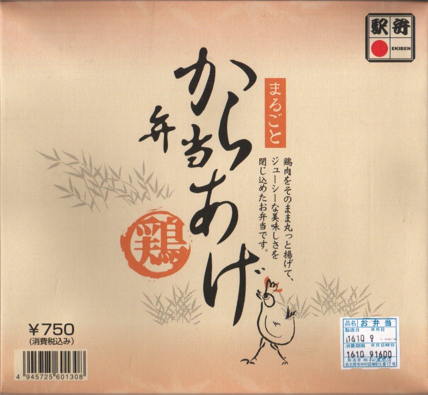 2004(平成16)年の新作駅弁か。暖かい色彩と質感を持つ正方形のボール紙容器を赤い紙帯で締める。中身は俵飯に鶏唐揚その他が入るシンプルな内容。通常は鶏肉を切ってから揚げる唐揚を揚げてから切る製法で、見た目でも香りでも味でも鳥の存在感がより強く出ており、これで750円とはお買い得。2012年頃に「でかから弁当」へリニューアルか。