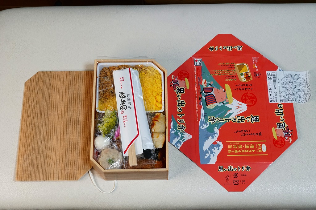 赤いふたには富士山と白波に中身の絵柄、そしてサントリーのトリスウイスキーの広告キャラクターとして65年の歴史を持つ柳原良平のイラスト「アンクルトリス」がいくつも描かれる。中身は伝統の名古屋駅弁「とり御飯」と、鶏もも焼、鶏つくね串、焼さわら、かまぼこ、玉子焼、しゅうまい、カレーコロッケ、鶏肉の磯辺揚げ、ブロッコリー、タケノコやニンジンなどの煮物、きんぴらごぼう、うずら卵、梅バンバンジーの詰合せ。鶏づくしと、名古屋駅弁の伝統と、幕の内駅弁の構成を、コンパクトに折り重ねた実力派。しかし2024年の春頃で終売。