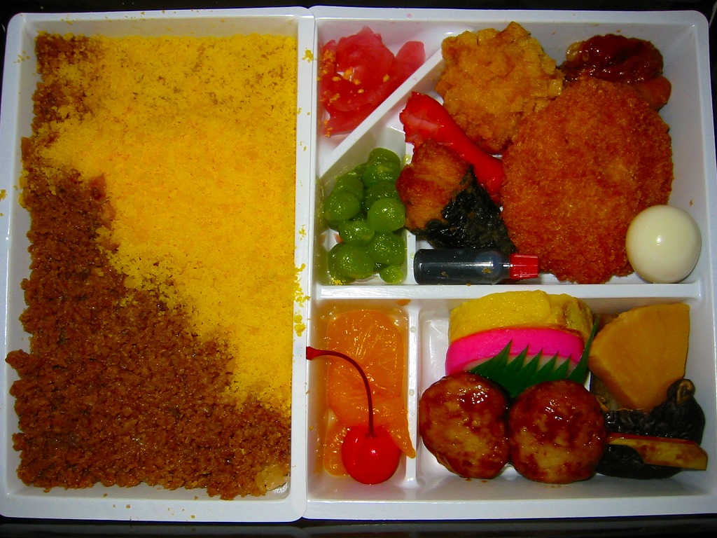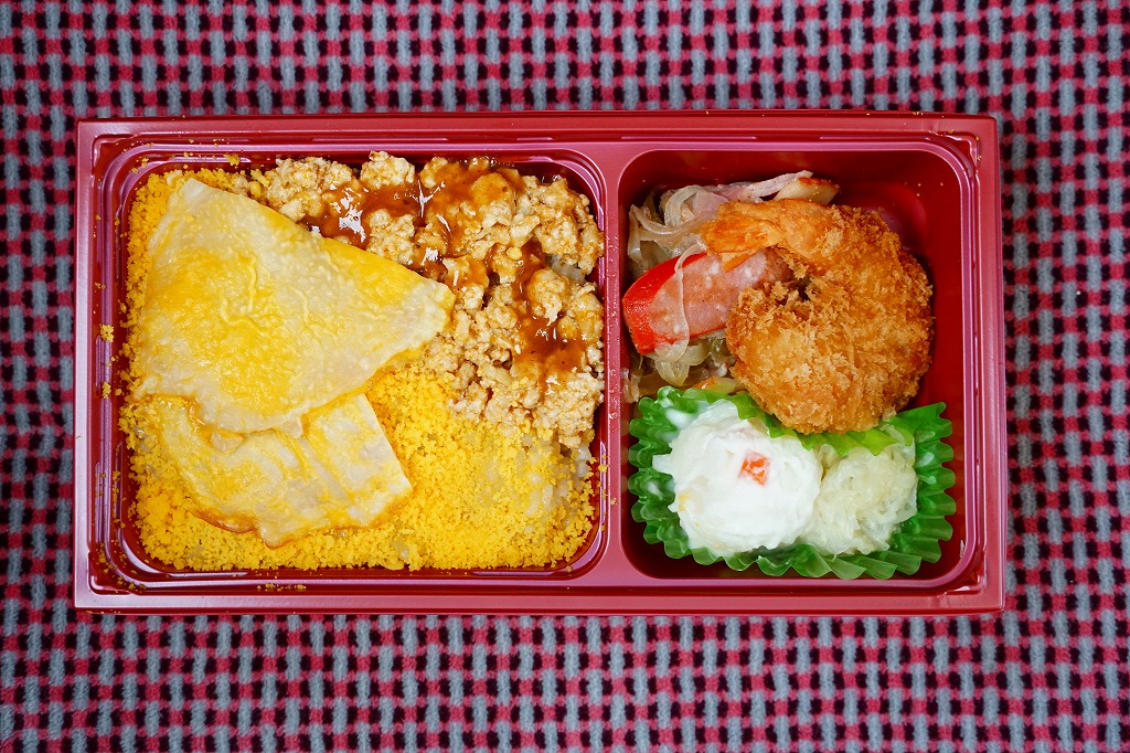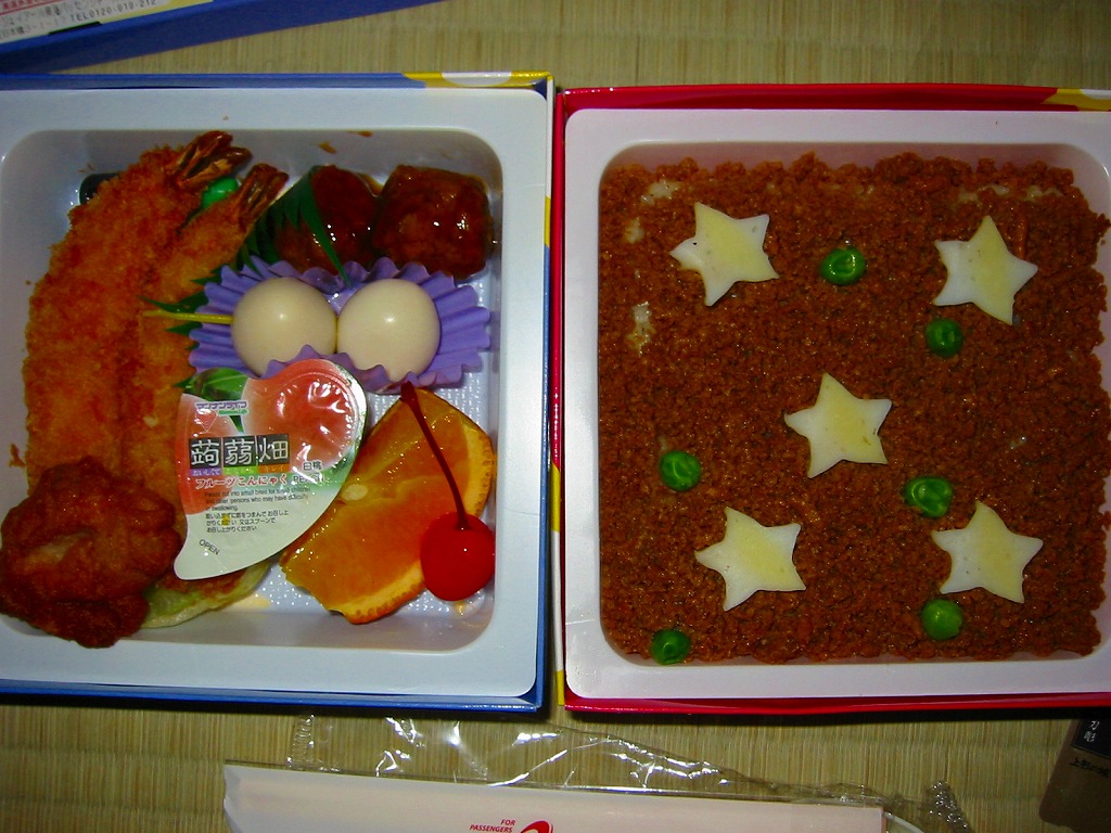 赤と青の正方形の紙箱を二段重ねにして紙のふたをかけて透明な帯で十字にしばる。中身は下段が星形蒲鉾とグリーンピースで星空を描いた鶏そぼろ御飯、上段がエビフライ、肉団子、うずら卵、鶏唐揚にデザートがこんにゃくゼリー・オレンジ・さくらんぼと三種も付いている。