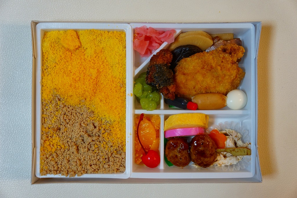 2015(平成27)年1月の阪神百貨店の駅弁大会で販売されたお弁当。実演販売のため、調製元が百貨店となっている。名古屋駅弁「とり御飯」が生まれる前の第二次大戦前の絵柄を掛紙に使用、中身はとりそぼろと玉子そぼろの親子飯に、玉子焼、かまぼこ、うずら卵、煮物など。現在のとり御飯から多くのおかずを省略した内容で、味もそんなもの。こういうとり御飯、特製でないとり御飯が、今の名古屋駅にあってもよいなと思った。