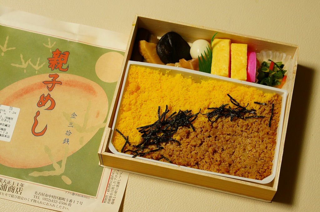 1955(昭和30)年頃あるいは1937(昭和12)年発売の「親子めし」をルーツに持つ、名古屋駅で伝統の駅弁。古くは通常版と、おかずの多い特製版があったが、現在はこの特製版のみを販売。2016(平成28)年4月頃に名前が「天下とり御飯」となった。容器のふたでは名古屋城を鶏で描く。