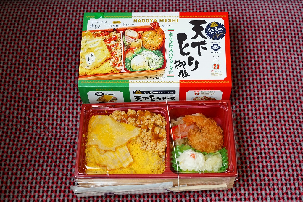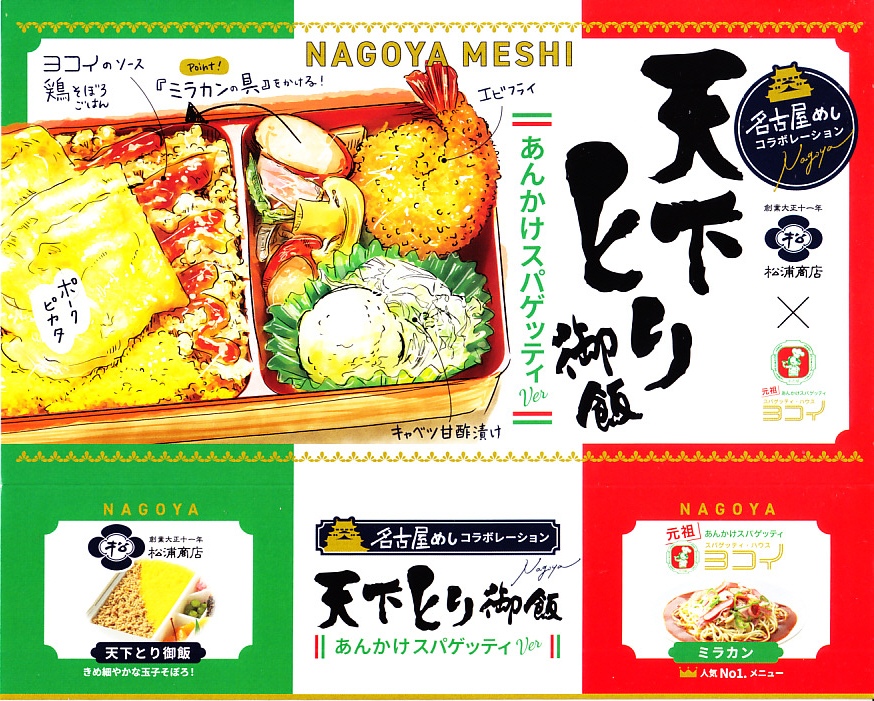 2024(令和6)年10月1日に名古屋駅や東京駅などで発売、同月のJR東日本の駅弁キャンペーン「駅弁味の陣2024」にエントリー。東海道新幹線の開業60周年を記念した企画だと紹介された、名古屋駅で伝統の駅弁の流れを汲む「天下とり御飯」と、元祖あんかけスパゲティ「ヨコイ」のコラボ弁当。駅弁の名前は「名古屋めしコラボ天下とり御飯×ヨコイ」とも。