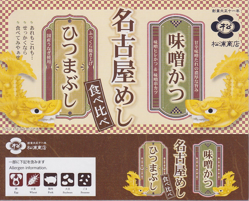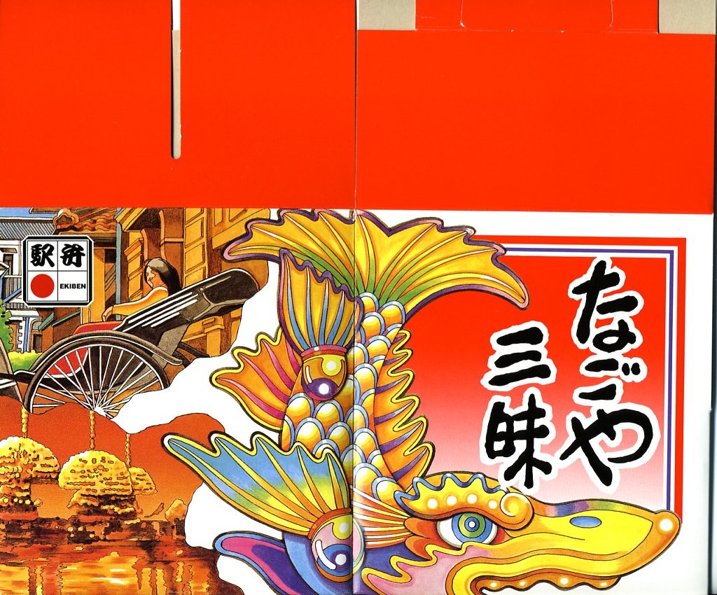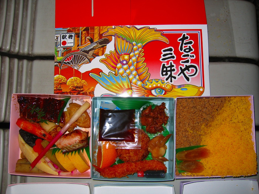 1980年代に発売。パステルカラーで色違いのふた付き正方形ボール紙容器を三個、しゃちほこその他を絢爛に描くボール紙のパッケージに詰める。中身は下段が名古屋駅弁名物とり御飯、中段が味噌ダレを添付するカツやエビフライなど、上段が海老や鰻蒲焼や焼鮭に煮物各種。上段のウナギを刻んでいれば、三段で三種の名古屋(駅)名物を表現する、文字通りの名古屋三昧。
