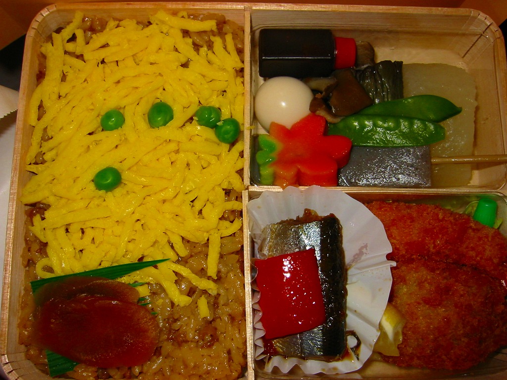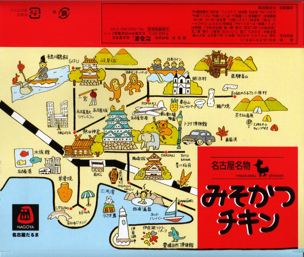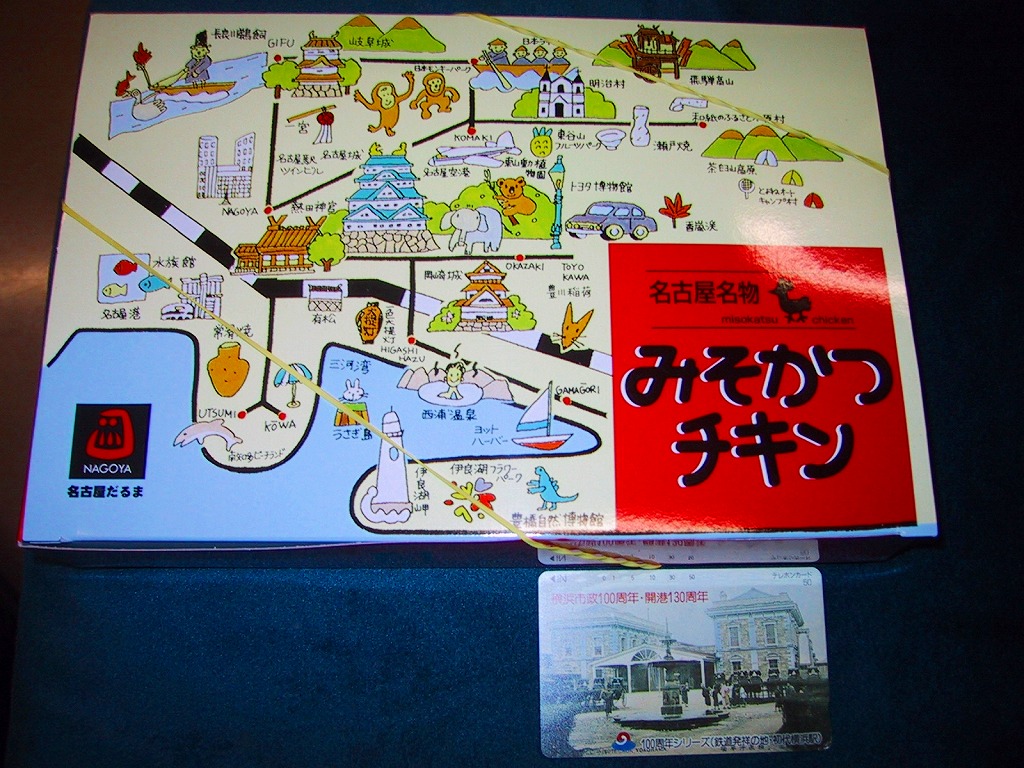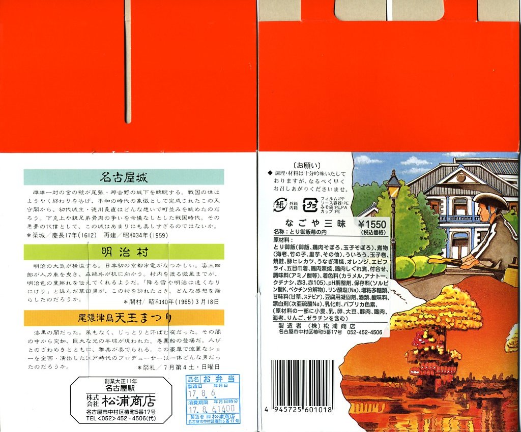 名古屋近郊の観光名所を満載したイラストを描いたボール紙の箱の中にトレーを入れる。中身は日の丸御飯に、豚ではなく鶏の味噌カツが入り、鯖塩焼や蒲鉾に玉子焼なども入れられる。2004年以降に終売か。