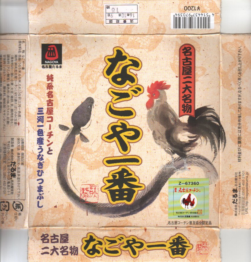 2004(平成16)年の秋に発売か。「抹茶ひつまぶし日本一弁当」と同じタイプの、強度のあるボール紙の正方形の容器を使用、駅弁の名前を記した紙帯で締める。中身はタレ御飯の上に純系名古屋コーチンの鶏肉が少々と、三河一色産のうなぎひつまぶし(鰻蒲焼の刻み)がそこそこと、守口漬が二切れ。濃厚な味が楽しめると同時に、外観も中身も価格も名古屋経済の元気さを象徴しているよう。