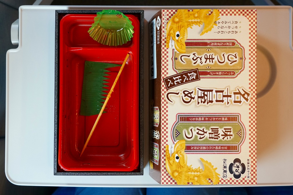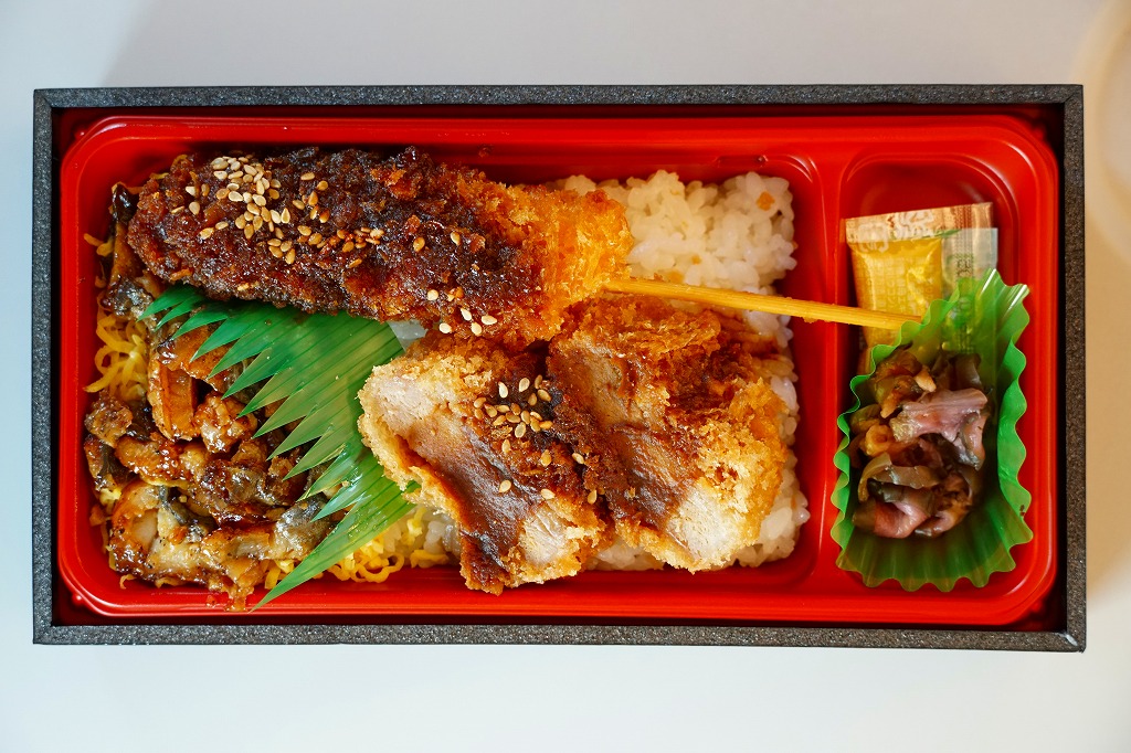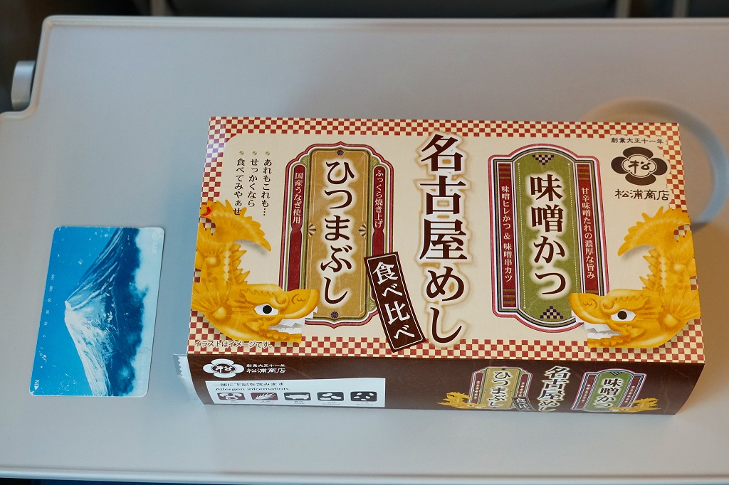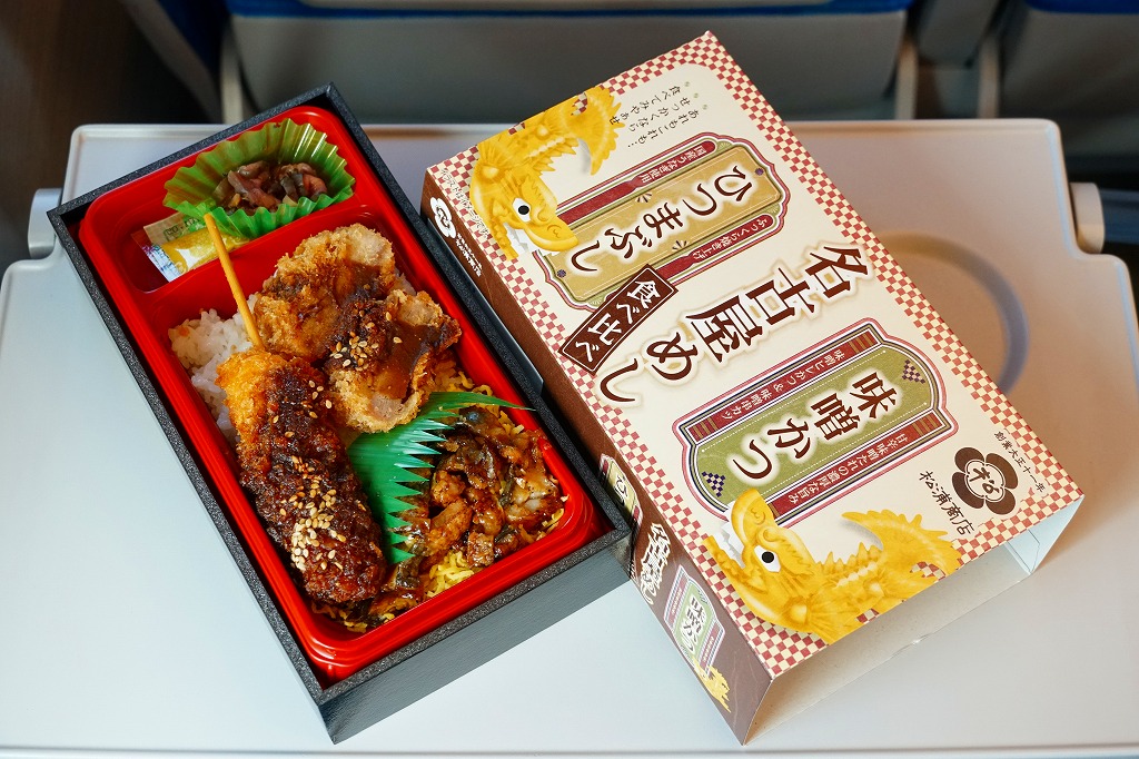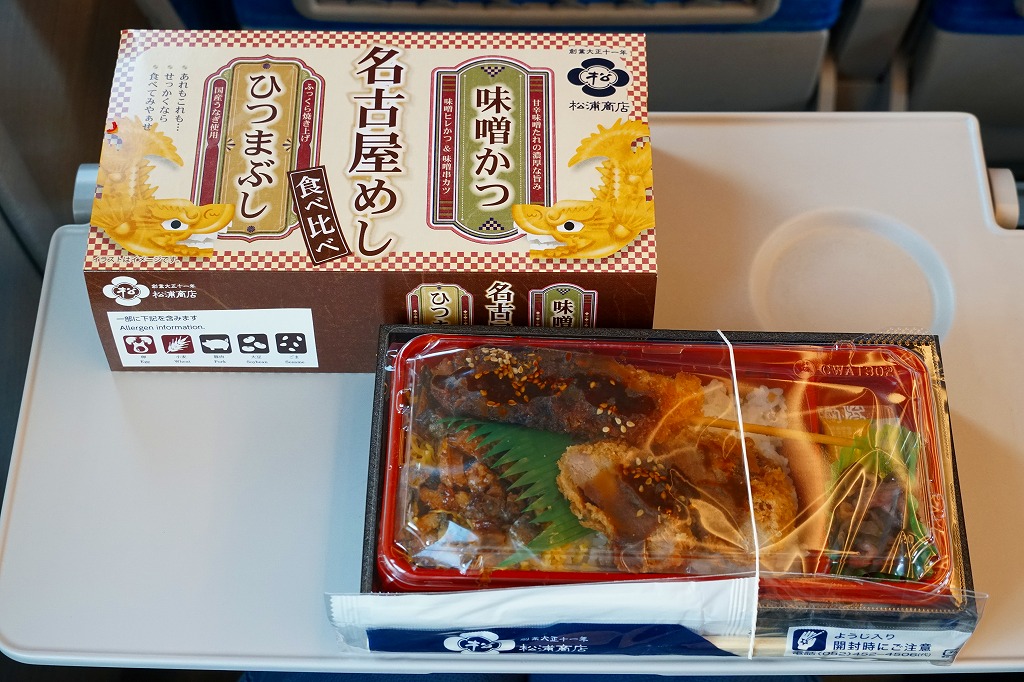 2024(令和6)年8月9日に名古屋駅で発売。スリーブの絵柄で見て分かるとおり、長方形のプラ容器に味噌かつとひつまぶしを同居させ、白御飯の上にヒレカツと串カツの味噌だれと、錦糸卵の上に刻んだウナギ蒲焼きを載せて、辛子と漬物を添える。異種の中身を仕切らずに詰めるのは、複数の中身を名乗る駅弁として珍しいと思う。味は混ざらないので、食べ比べはお好みで。