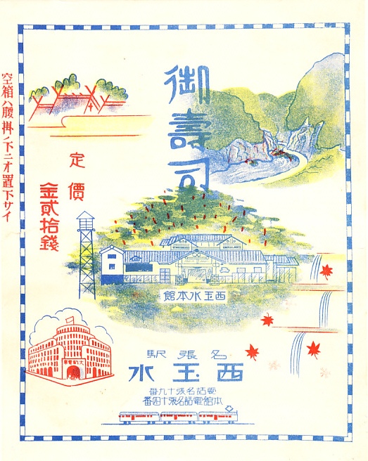 おそらく1930年代のものと思われる、昔の名張駅弁の掛紙。寺社と峡谷と「西玉水本館」の建物と、「大軌電車」と掲げるビルが描かれる。伊勢神宮と大阪上本町の大軌ビルディングの間にある名張の、名張川と調製元を描いたと推測。名張駅は国鉄やJRでなく、現在の近畿日本鉄道(近鉄)大阪線の駅。大阪電気軌道(大軌)の子会社である参宮急行電鉄が1930年に名張駅を開業、駅の東にある平尾山が観光地になり、そこにできた料亭兼旅館が、この駅弁の調製元である西玉水という。