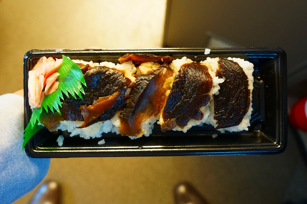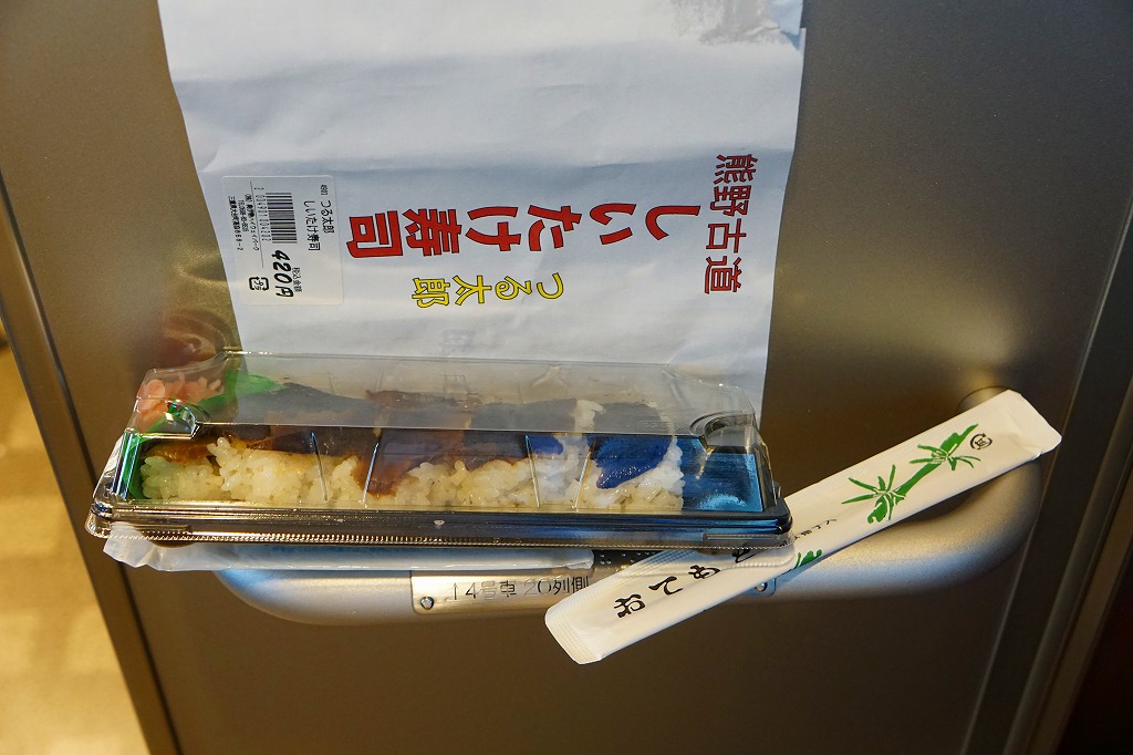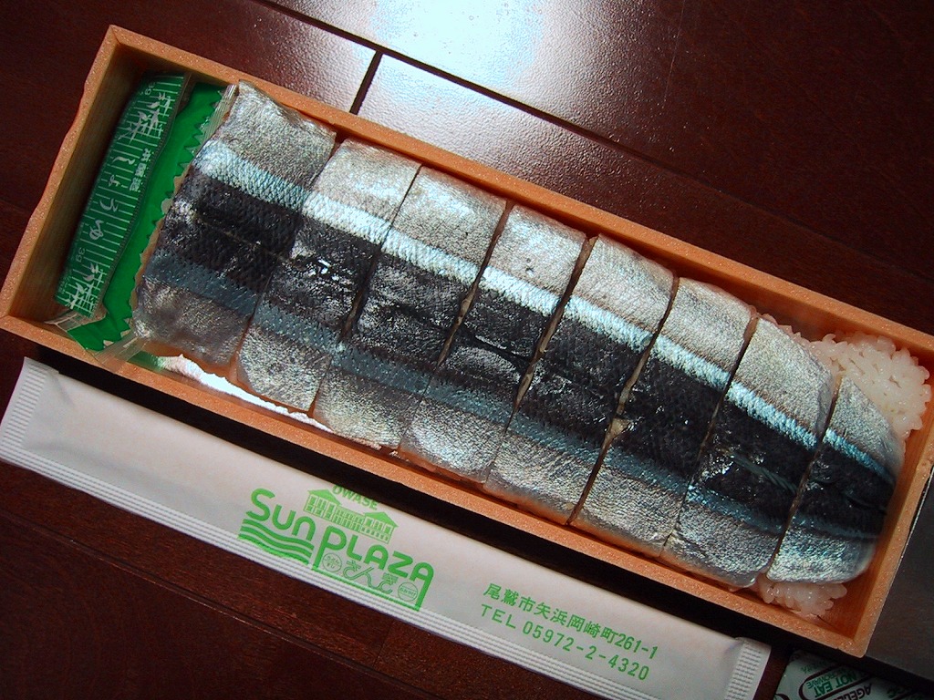 腹から割いて強く酢で締めたさんまを、酢飯の上に置いて一口サイズにカット、これを細長い容器に詰めて、厚手な空色のビニール袋に収めて密封している。価格は安めで味はそれなりだが、サンマなのに3日間も日持ちがするのは不気味でもある。これはスーパーの駅弁催事で紀勢本線尾鷲駅弁として出ていたもの。同じ商品が販売されているかどうか分からないが、サンマの姿寿司そのものは尾鷲の名物として、現地では食堂や土産物店で取り扱われているそうな。
