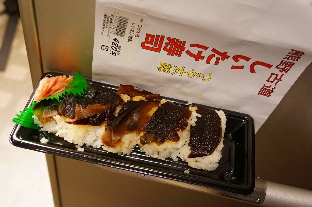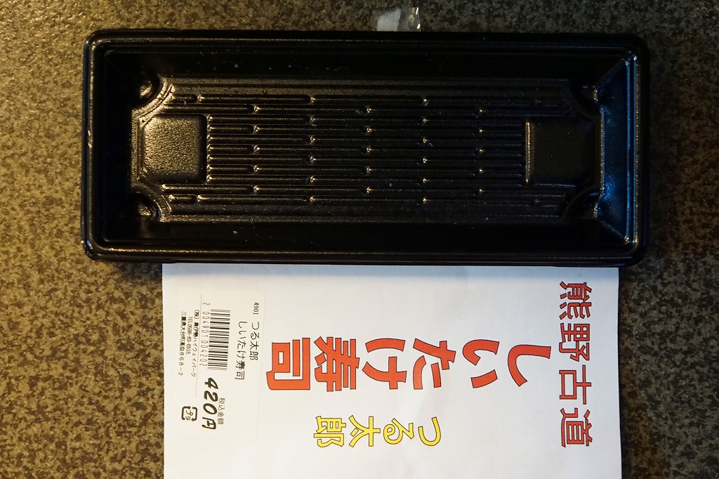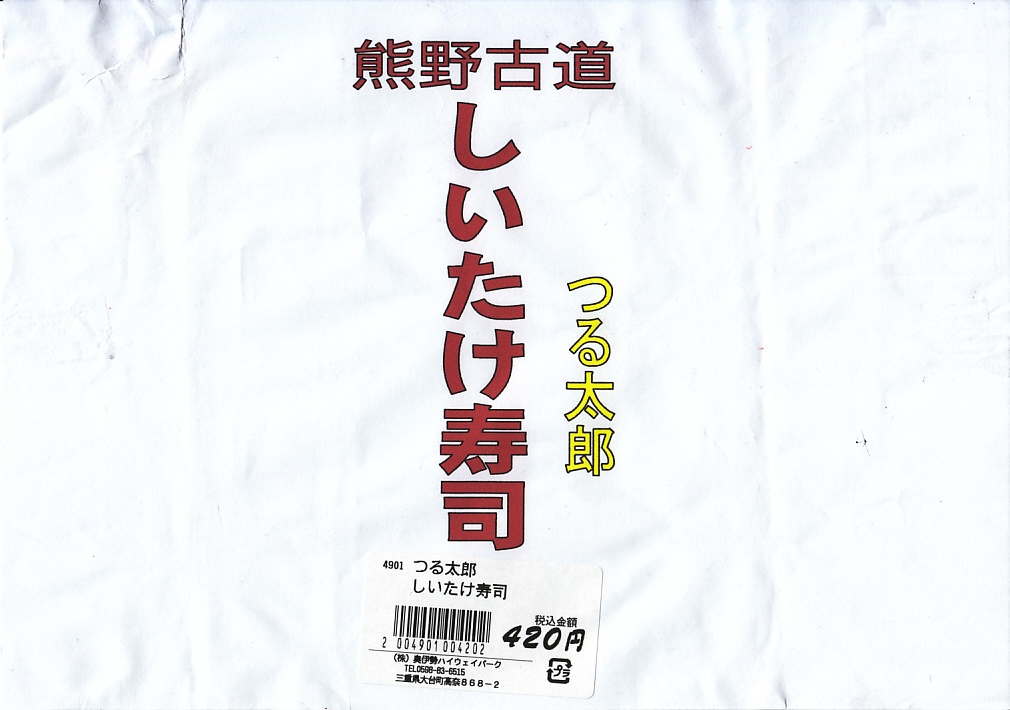 紀勢自動車道の奥伊勢パーキングエリアで買えたお弁当。高速道路会社の「速弁」ではない。惣菜向けの黒いトレーに、酢飯を敷き、シイタケ煮を並べ、ガリを添えて、商品名のみをコピー用紙にインクジェット印刷した掛紙を巻く。調製元はパーキングエリアの運営会社となっているが、商品名と掛紙に記される「つる太郎」で検索すると、三重県多気郡大台町の国道42号沿いの食堂と、これと同じ名前と中身の商品が出てくる。