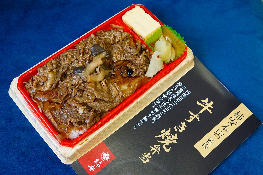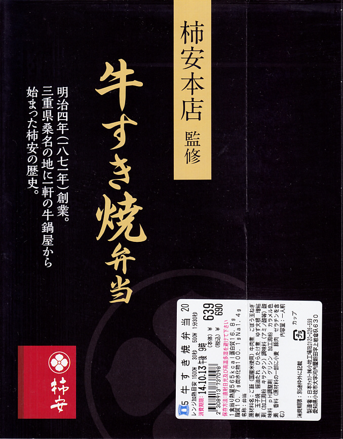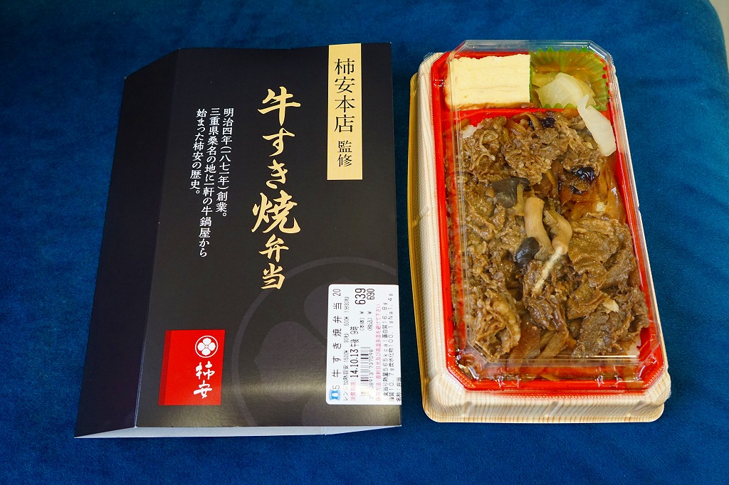 2014(平成26)年10月7日から4週間、全国のローソンで販売。コンビニエンスストア大手のローソンが、同じく全国にチェーン展開する牛肉等惣菜屋の柿安本店が監修する、弁当、おにぎり、手巻寿司の3品を販売したもの。黒いスリーブに収めた長方形の容器に白飯を詰め、牛すき焼で覆い、玉子焼と漬物を添えるその姿は、まるで駅弁そのもの。駅売店も駅弁屋も開いていない朝の亀山で、列車に乗る前に車中食として、つまり駅弁と同じ目的で買った。駅弁とは何かを考える材料として、三重県内で買ったことと、柿安の発祥地が三重県桑名なので、三重県のページに収蔵。