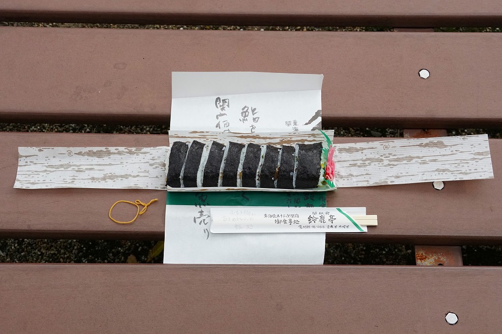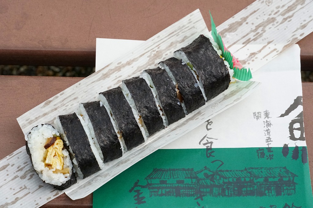三重県のJR西日本の関駅の駅舎で、正確には駅舎代わりの亀山市施設「関宿ふるさと会館」の、売店と待合室と軽食堂か喫茶店を兼ねた店舗で売る巻寿司。駅弁として紹介されることはないが、駅の中で買える商品であるほか、駅近くの重要伝統的建造物群保存地区の関宿を紹介するチラシやガイドブックには、ここの名物としてたいてい載っていると思う。調玉子焼とかんぴょうときゅうりのみを巻いた太巻きを、竹皮柄の紙で包み、寿司店の包装紙で包む。とてもふんわり柔らかく、駅弁や惣菜でなく寿司店の寿司飯が心地良い。外観や中身に特徴がないのに、この風味は記憶に残る。調製元は関駅の目の前の寿司店。水曜定休。