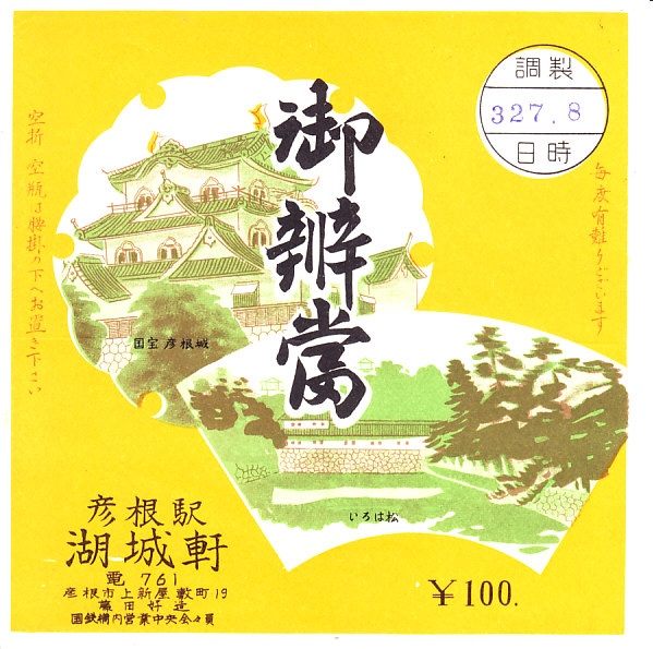 1960年代の、3月27日8時の調製と思われる、昔の彦根駅弁の掛紙。国宝彦根城といろは松を描いた。