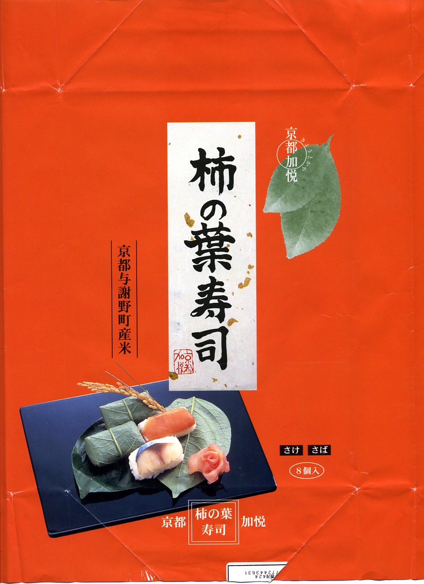 調製元は京都府加悦町、現在の与謝野町が1999年に設立した、冷凍米飯加工事業と精米事業を持つ第3セクター。玄米ごはん、焼き鯖寿司、そしてこの柿の葉寿司と、どこでも作っている商品を作る工場に補助金と交付金を何億円も注いでおり、何かコトがあればワイドショーで散々に叩かれるだろうが、地元の米をただ売るだけではなく付加価値を付け、そこに雇用も生むことそのものは、正しい地域振興の姿だとも思う。