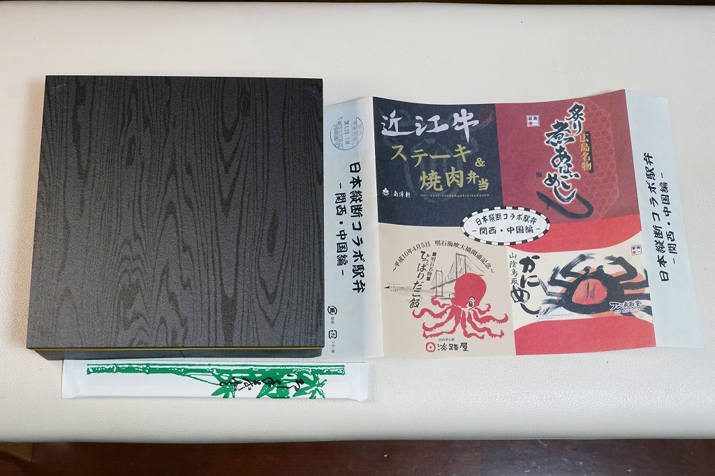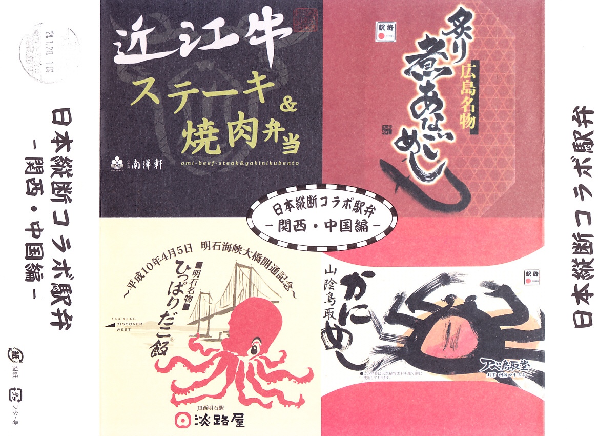 この関西・中国編は、滋賀県の草津駅「近江牛ステーキ&焼肉弁当」と、広島県の広島駅「炙りあなごめし」と、鳥取県の鳥取駅「山陰鳥取かにめし」と、兵庫県の西明石駅「ひっぱりだこ飯」の詰合せ。大きな掛紙には、その4種類の駅弁の掛紙の一部や縮小版をタイル状に組み合わせた。中身も正方形の4区画で、それぞれの御飯の部分を詰合せ。味も当然に、それらと同じ。