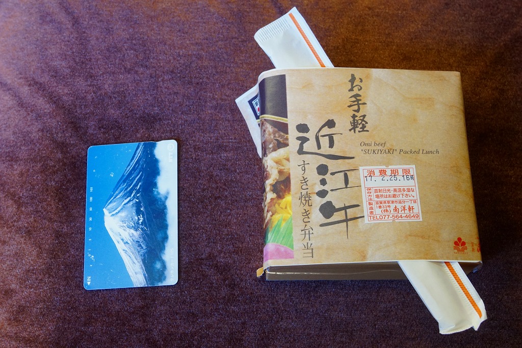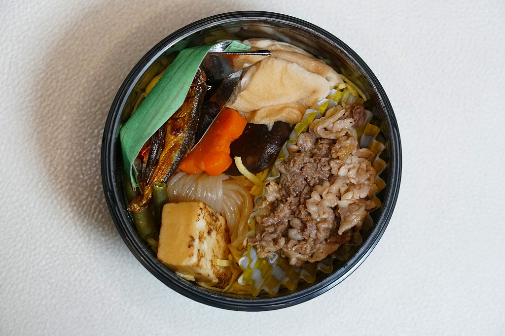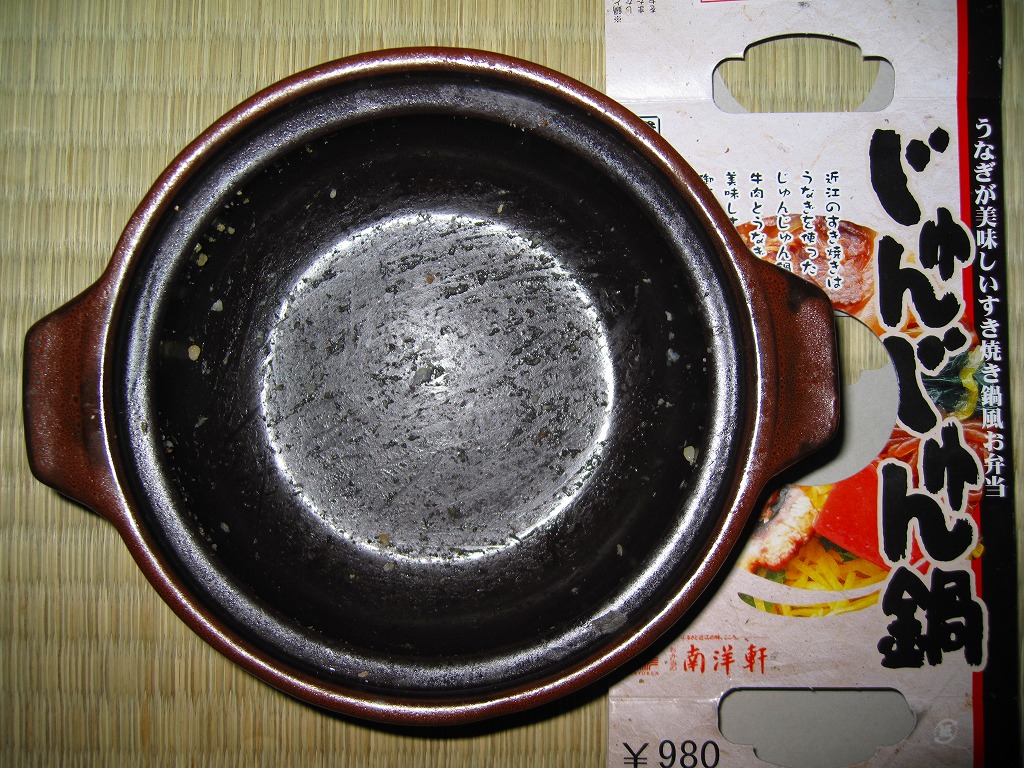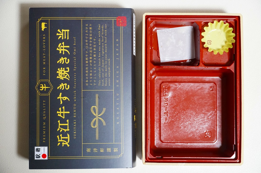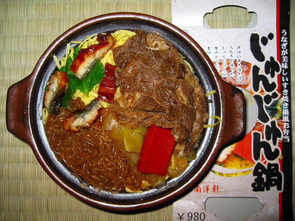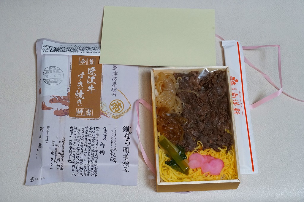 確かにすき焼き鍋の雰囲気がたっぷり。分量は少量だけれども、容器の質感も含めてお腹いっぱいにしてくれる。草津駅のような駅弁の実需がなくなった駅ではなく、東海道新幹線「のぞみ」停車駅で出ていれば、もっと話題を呼んだのではないかと思う。すき焼きを「じゅんじゅん」と呼んだり、具にウナギや赤コンニャクを入れる点は、琵琶湖の南西側の滋賀県では当たり前のことである模様。
