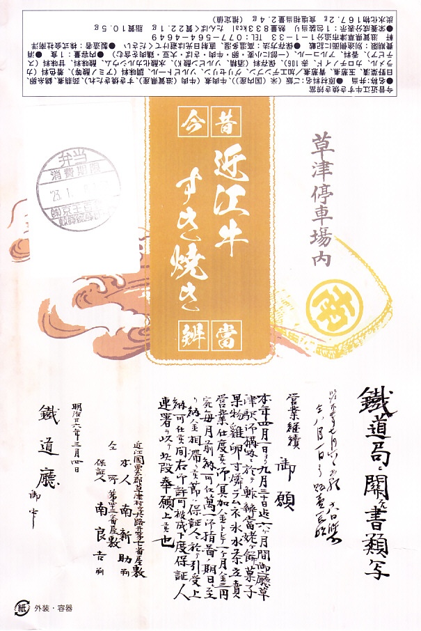 2022(令和4)年10月8日に「復刻近江牛すき焼き弁当」の名前で、草津駅と京都駅と新大阪駅で発売、23日まで販売。日本鉄道構内営業中央会の鉄道開業150年記念復刻駅弁企画により、同月から期間限定で販売された31社34駅弁のひとつ。その後もスーパーやデパートの駅弁催事で売られ、年が明けた1月の京王百貨店の駅弁大会にも出てきた。掛紙の絵柄はおそらく、昔風に作った上半分と、調製元に残る古い承認願を、1889(明治22)年7月1日承認の営業許可の継続について1893(明治26)年3月4日付で鉄道庁へ提出した書類の写しを転記した下半分。