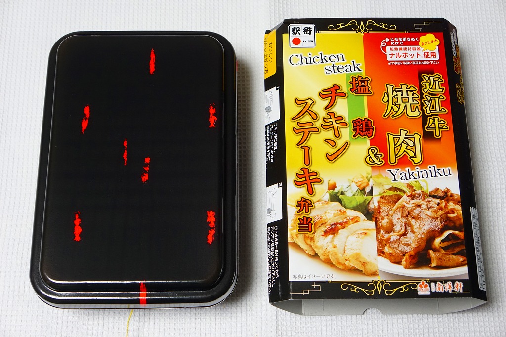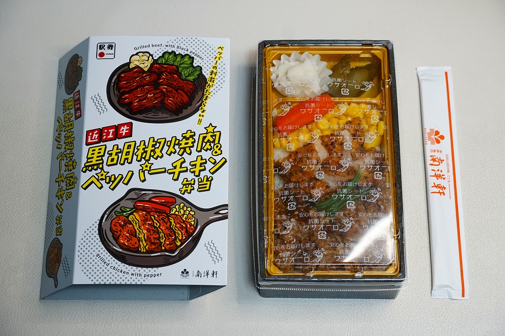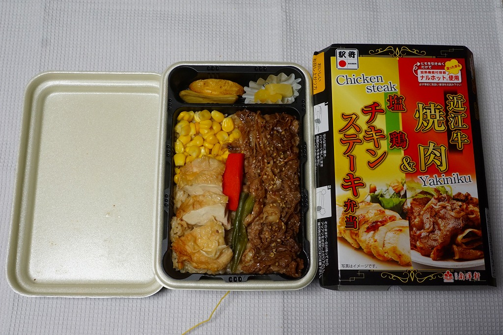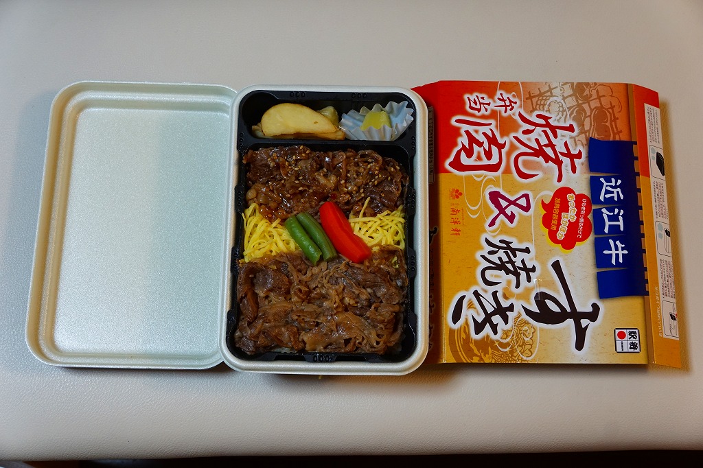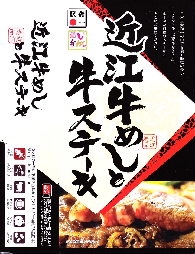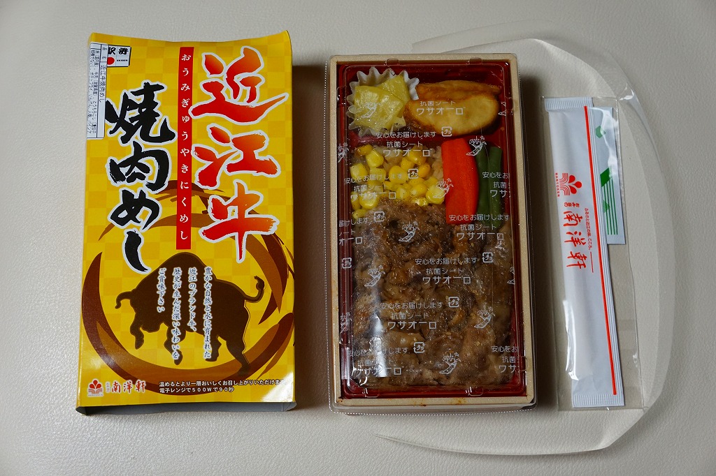 2016(平成28)年1月までに発売か。長方形の加熱機能付き容器に茶飯を詰め、駅弁の名前どおりの近江牛焼肉と塩鶏チキンステーキで半分ずつ覆い、ニンジンとインゲンで仕切り、コーンとポテトとパインを添える洋食弁当。牛焼肉はまあまあ、照焼のスライスのような形状の塩鶏3個は、ほんのり塩気の薄味と、柔らかくヘルシーな印象の身がとても美味だった。価格は2016年の発売時や購入時で1,190円、2020年時点で1,280円、2023年時点で1,440円、2024年時点で1,600円。