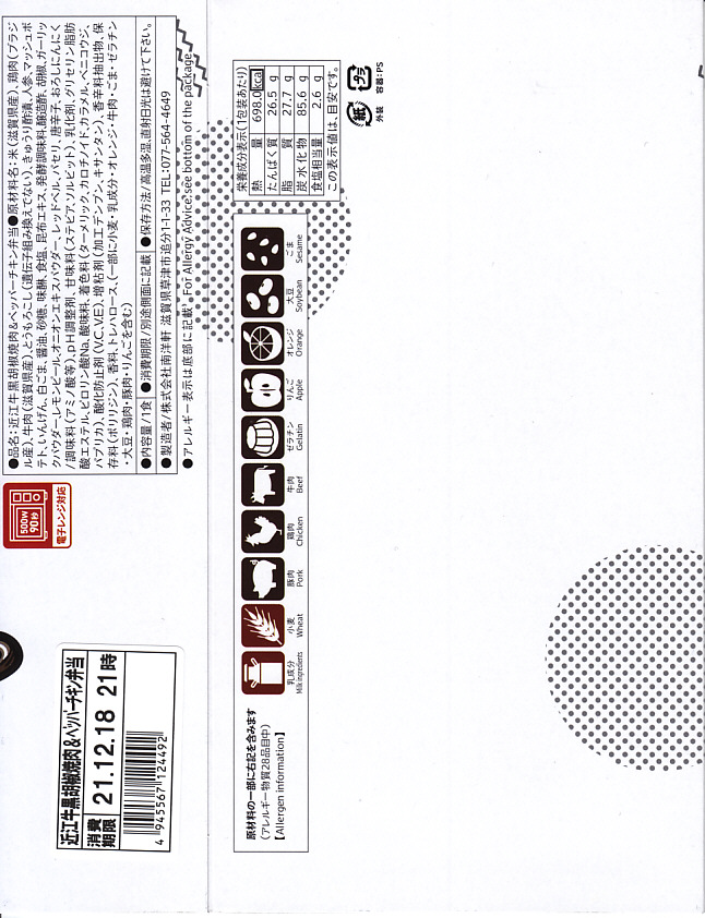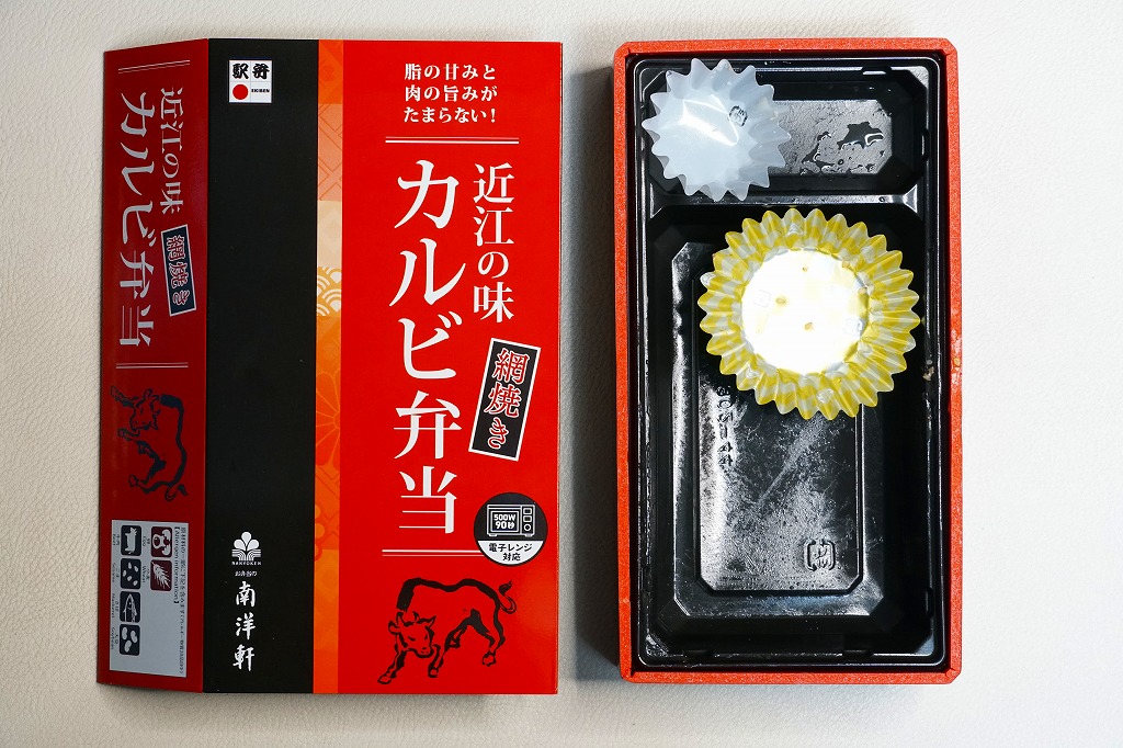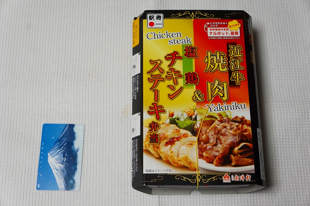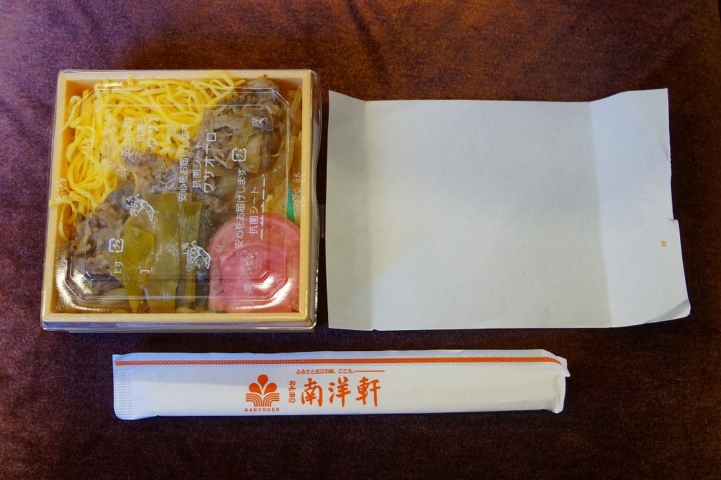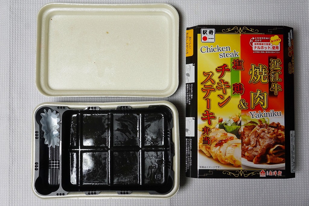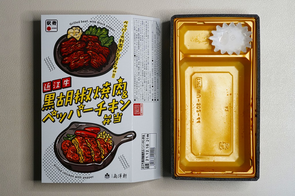 2016(平成28)年1月までに発売か。長方形の加熱機能付き容器に茶飯を詰め、駅弁の名前どおりの近江牛焼肉と塩鶏チキンステーキで半分ずつ覆い、ニンジンとインゲンで仕切り、コーンとポテトとパインを添える洋食弁当。牛焼肉はまあまあ、照焼のスライスのような形状の塩鶏3個は、ほんのり塩気の薄味と、柔らかくヘルシーな印象の身がとても美味だった。価格は2016年の発売時や購入時で1,190円、2020年時点で1,280円、2023年時点で1,440円、2024年時点で1,600円。