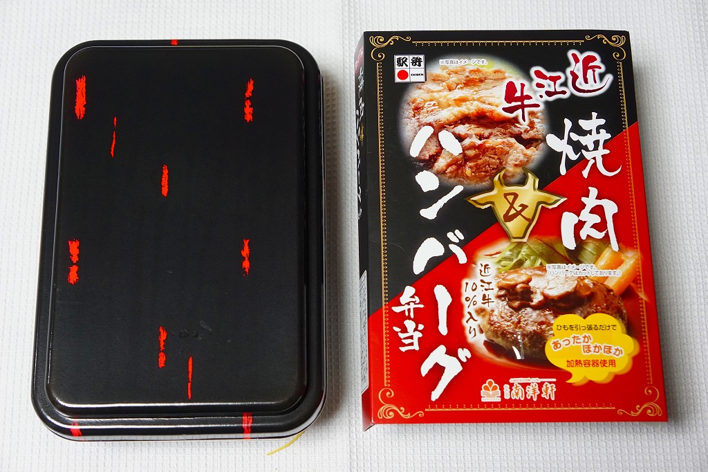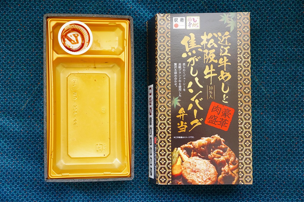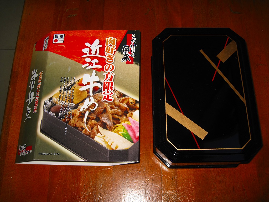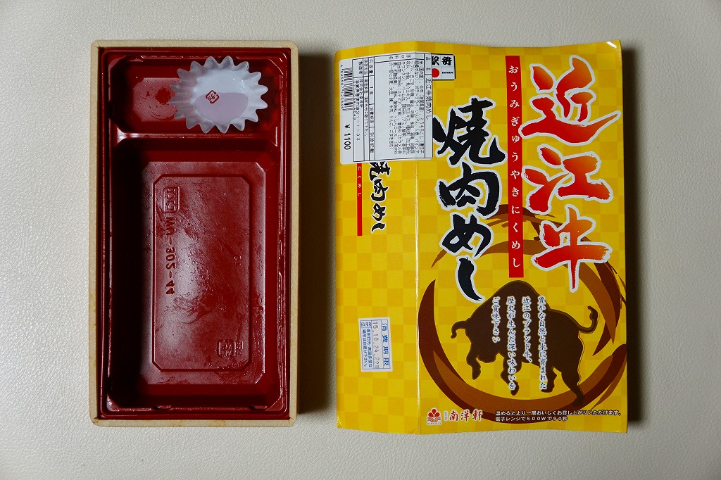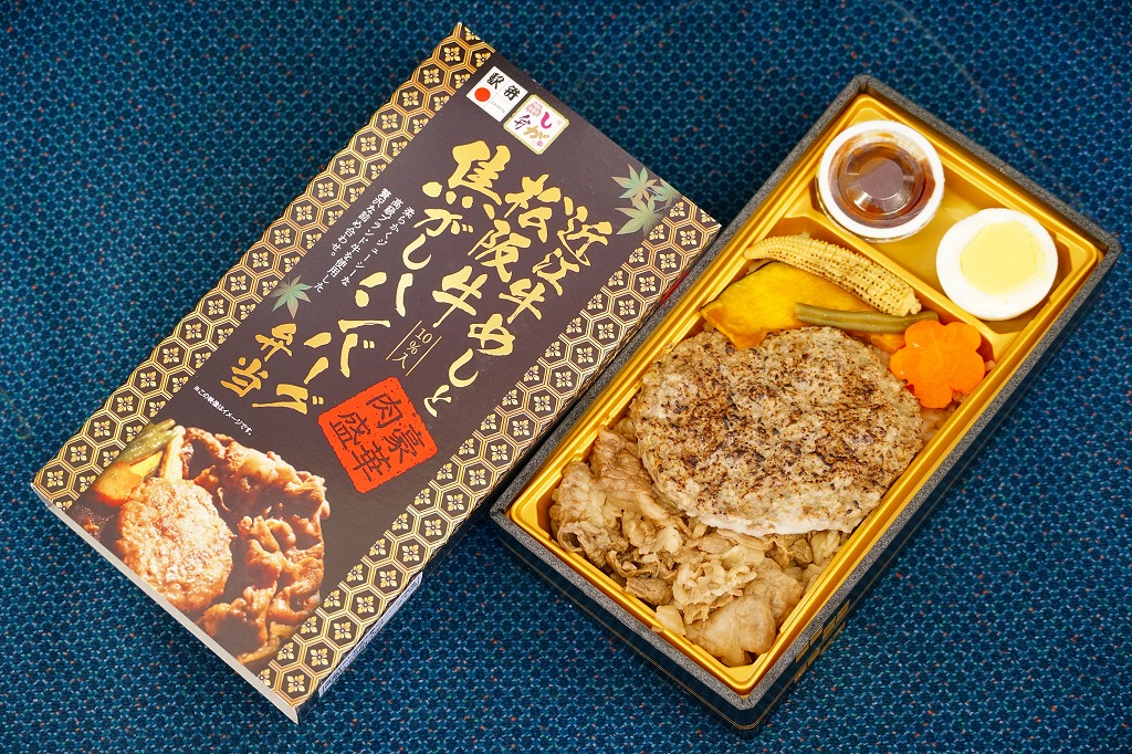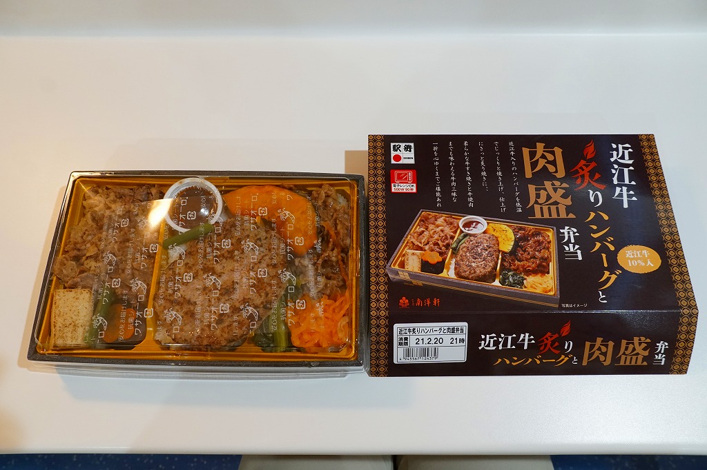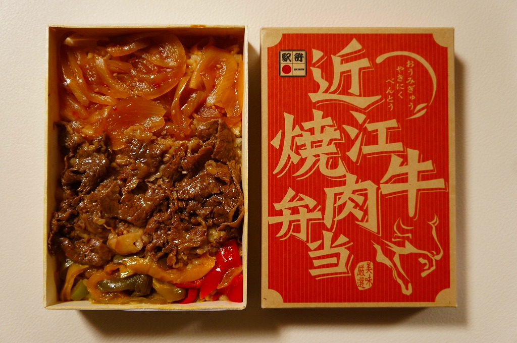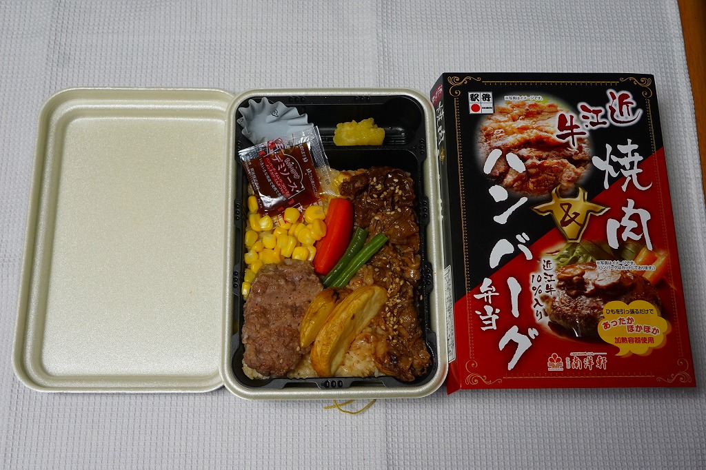 2014(平成26)年の秋頃の発売か。長方形の加熱機能付き容器に味付飯を詰め、近江牛の焼肉、近江牛を100%でなく10%入れたハンバーグ、ポテト、ニンジン、インゲン、コーンで覆う。味は下記のとおり少し前に京王百貨店の駅弁大会で買って食べた加熱式の草津駅弁と同じく良好。肉は少なくても、彩りが豊かで、各地の駅弁と並べるのに向く感じ。価格は2014年の発売時で1,300円、2023年時点で1,340円を経て1,480円、2025年時点で1,560円。