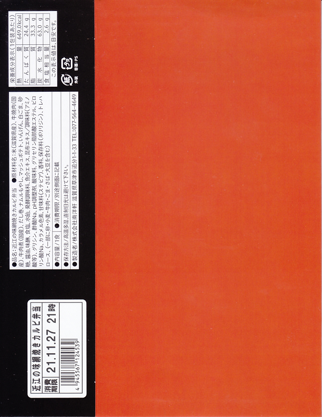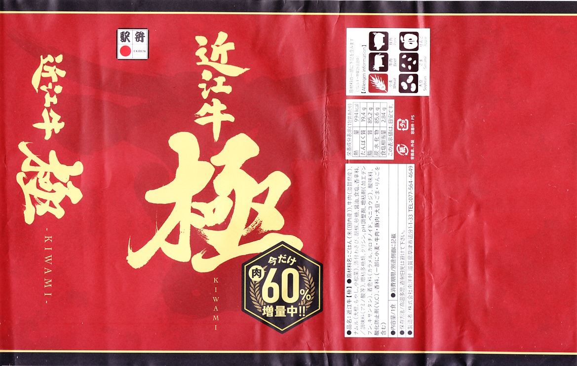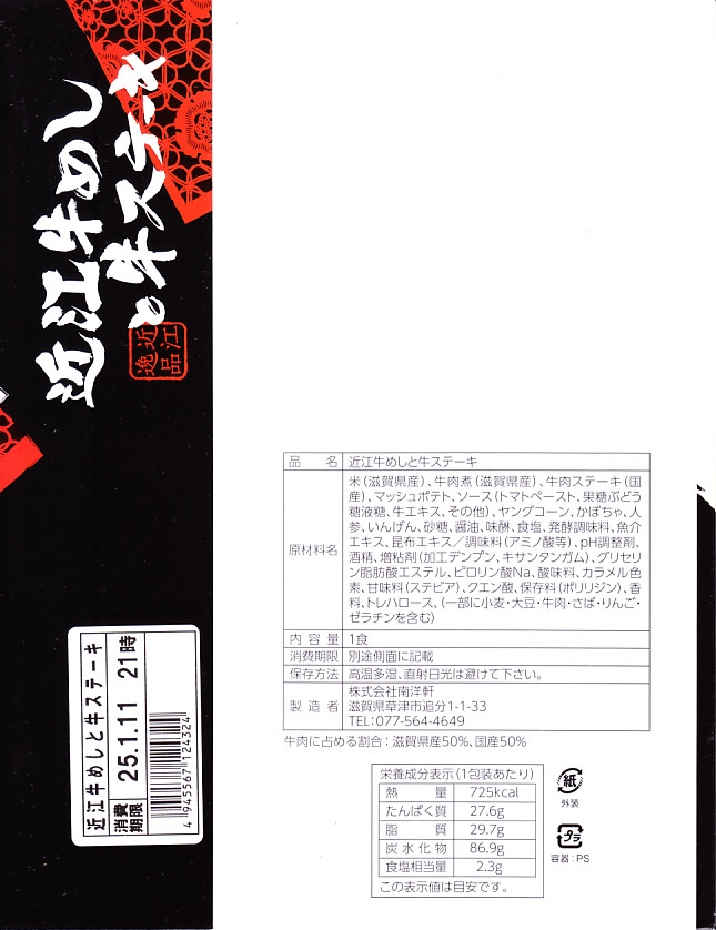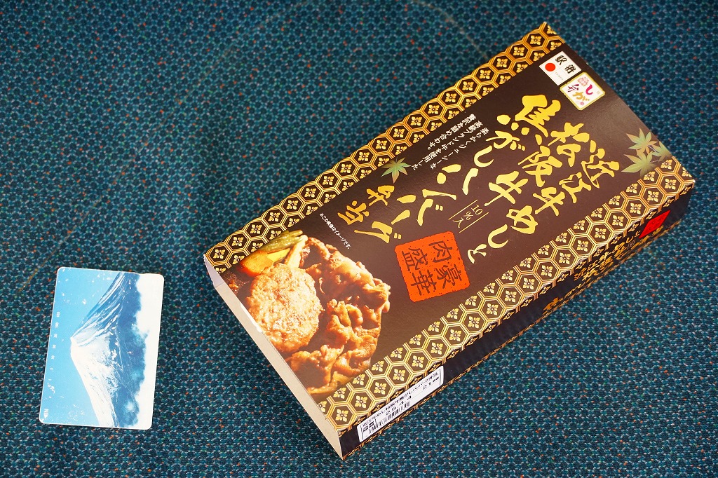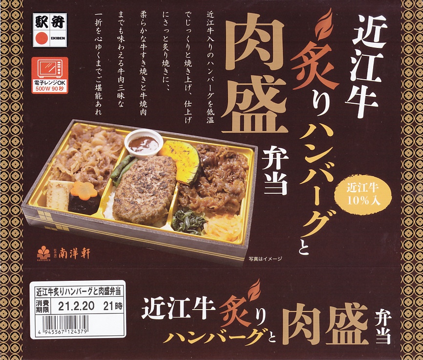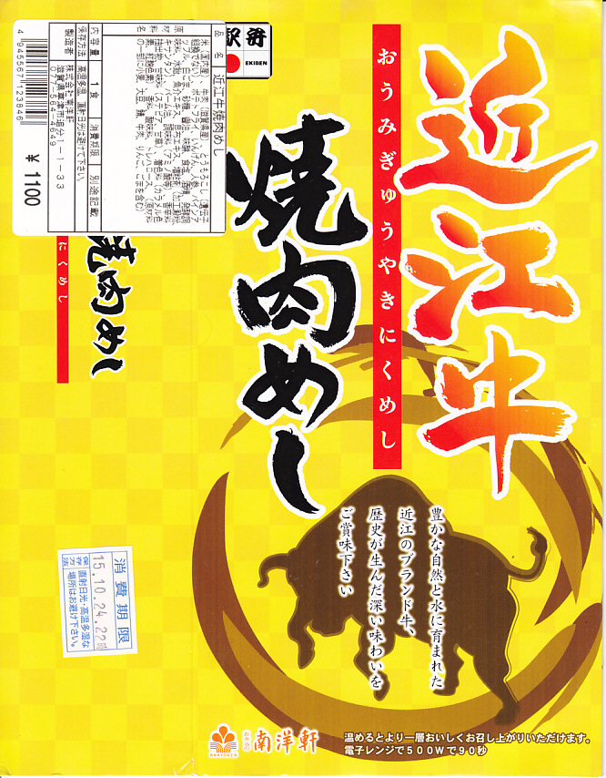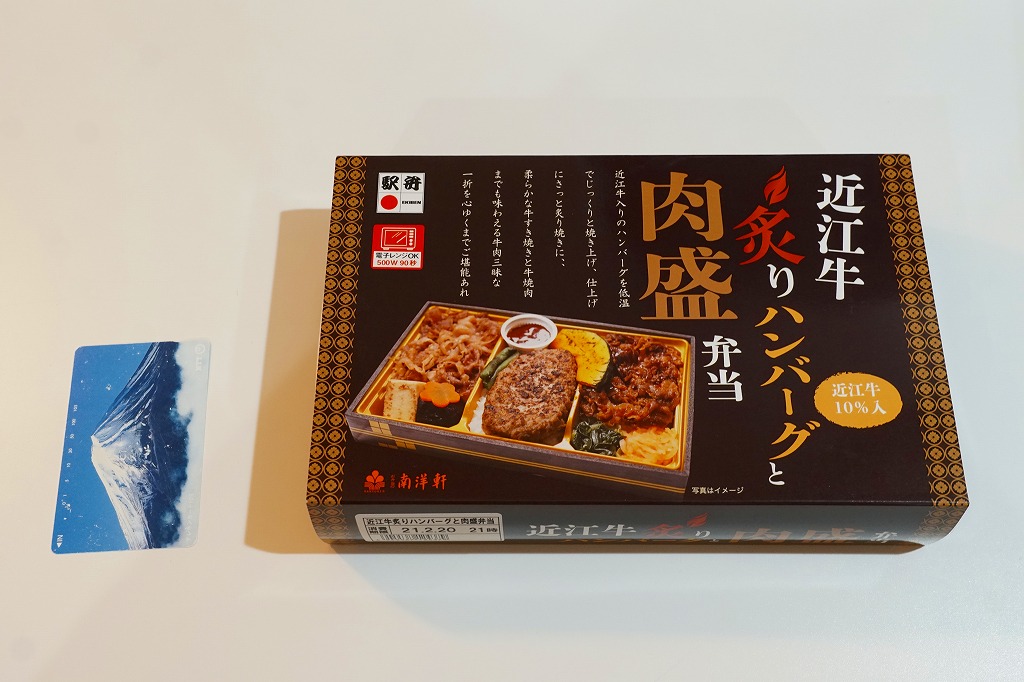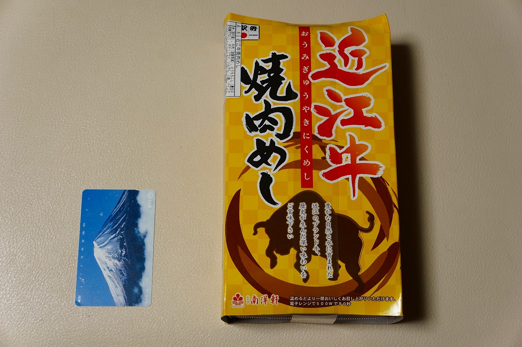 2014(平成26)年の秋頃の発売か。長方形の加熱機能付き容器に味付飯を詰め、近江牛の焼肉、近江牛を100%でなく10%入れたハンバーグ、ポテト、ニンジン、インゲン、コーンで覆う。味は下記のとおり少し前に京王百貨店の駅弁大会で買って食べた加熱式の草津駅弁と同じく良好。肉は少なくても、彩りが豊かで、各地の駅弁と並べるのに向く感じ。価格は2014年の発売時で1,300円、2023年時点で1,340円を経て1,480円、2025年時点で1,560円。