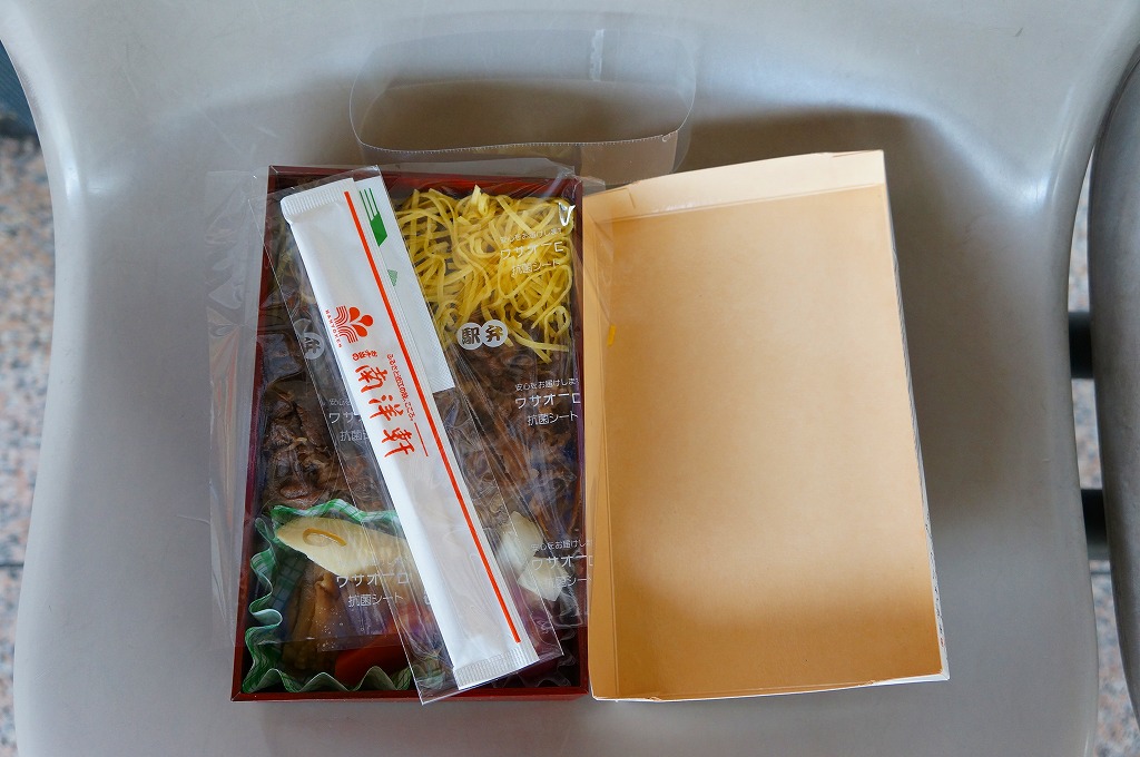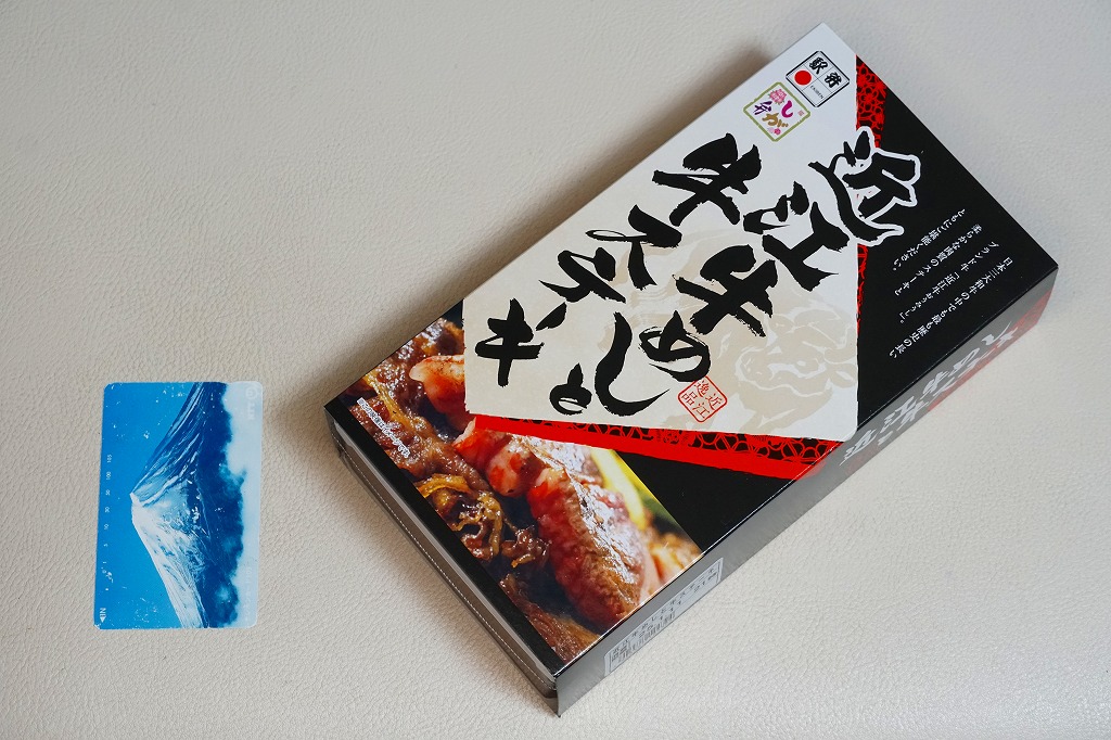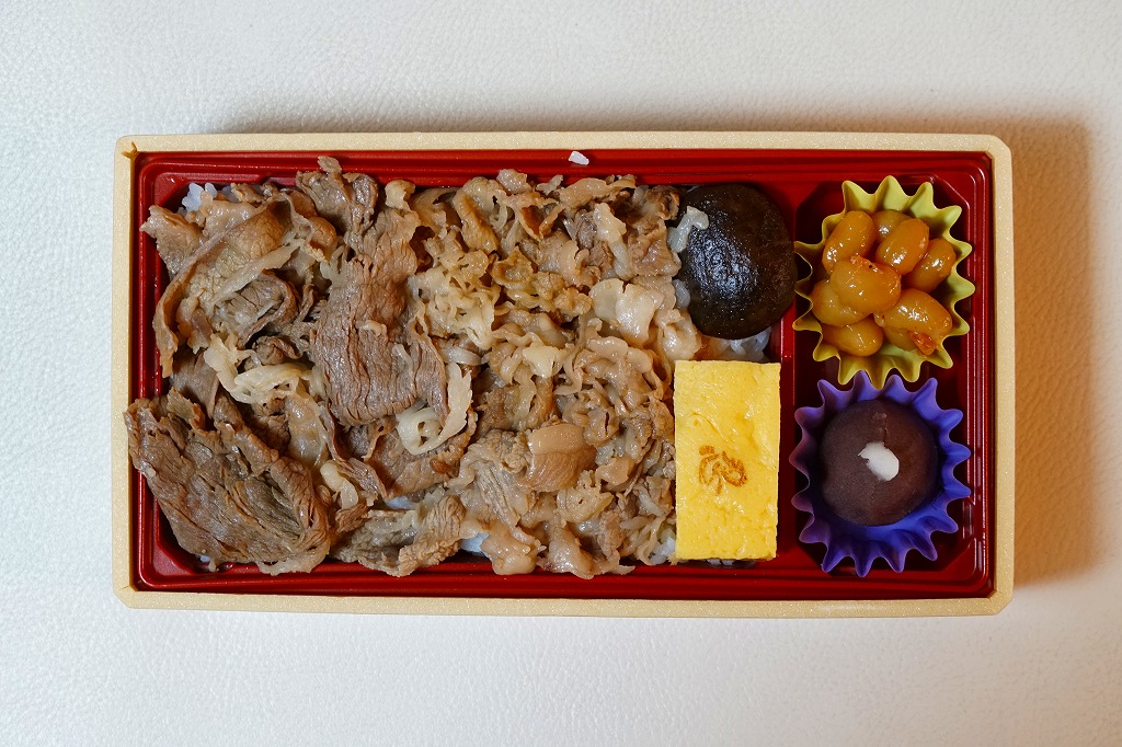 2013(平成25)年の発売。草津駅で予約を要せず買うことができる、数少ない駅弁のひとつ。小柄な容器に白飯を詰め、牛焼肉と錦糸卵で覆い、ネギ、タマネギ、糸こんにゃく、大根桜漬を添える。東京や大阪で賑やかな上記や下記の駅弁で食べた味が、そのままコンパクトに詰まっていた。価格は2013年の発売時や2017年の購入時で520円、2020年時点で580円、2023年時点で650円。2023年までの販売か。