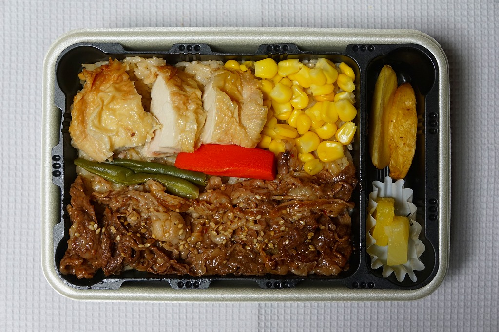 秋冬の駅弁大会シーズンに向けた、2021(令和3)年秋の新商品。中身のイメージイラストを載せたスリーブに収める長方形のプラ容器に、白飯を詰め、牛焼肉と鶏照焼、コーンとニンジンで覆い、ピクルスとマッシュポテトを添える。催事や輸送販売で他社の商品に見劣りしない名前と見栄えを、よく備えていると思う。このシーズンの半年間ほどの販売か。