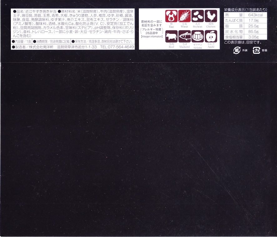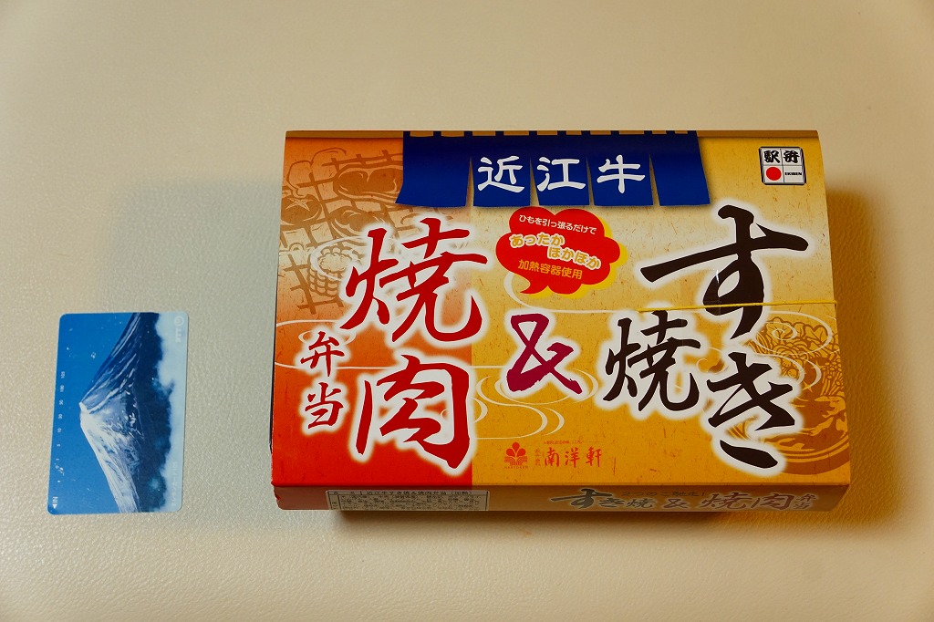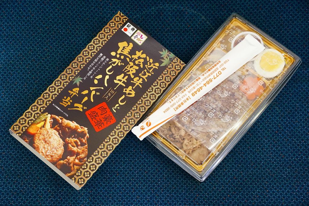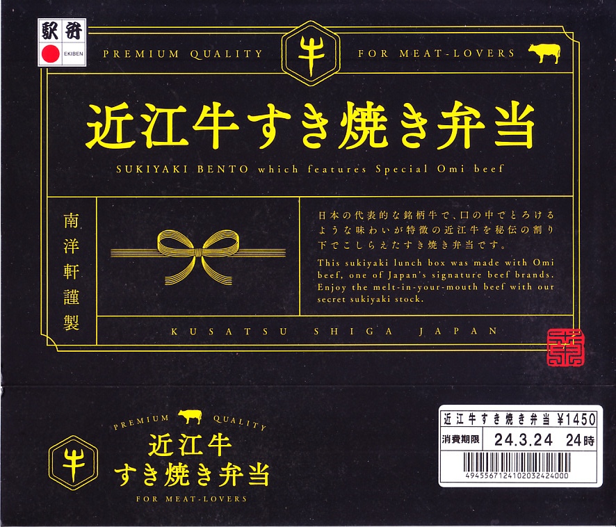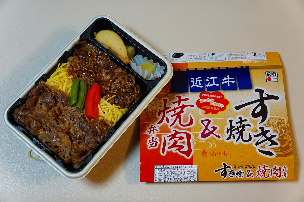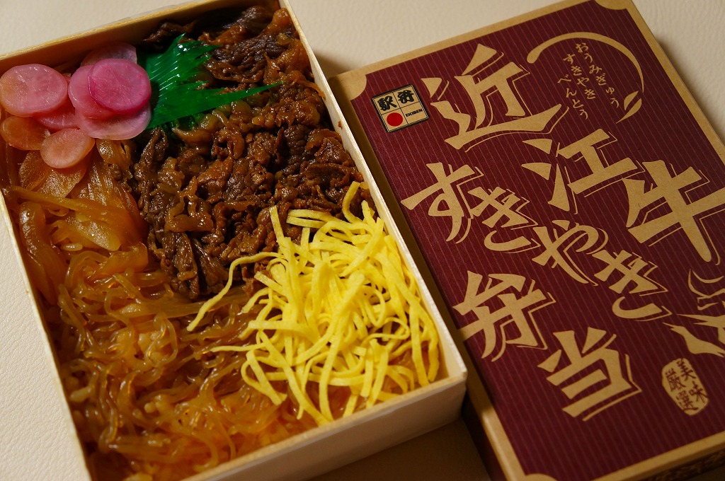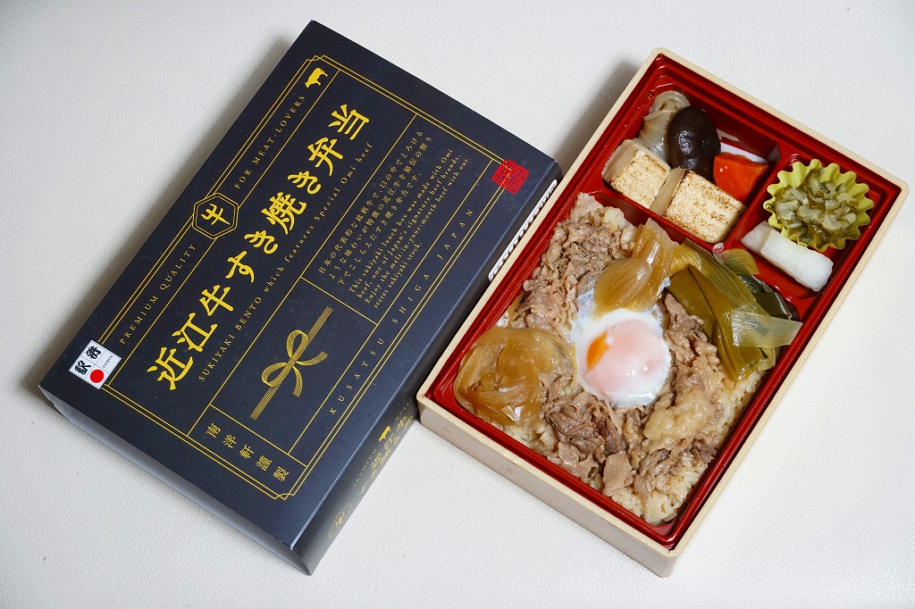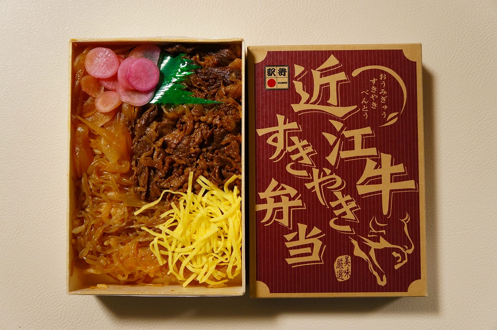 2015(平成27)年1月の京王百貨店の駅弁大会や阪神百貨店の駅弁大会の頃までに発売された、駅弁大会専用商品か。長方形の加熱機能付き容器に御飯を詰め、近江牛のすき焼きと焼き肉で覆い、錦糸卵とニンジンとインゲンで仕切り、ポテトフライとパイナップルを添える。他の草津駅の牛肉駅弁と同じく、真っ黒で濃くて甘いビーフの風味。価格は発売時や2016年の購入時で1,500円、2020年時点で1,580円、2023年時点で1,650円、2024年時点で1,900円。