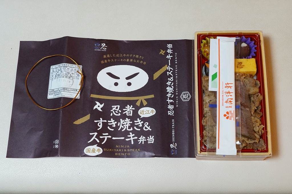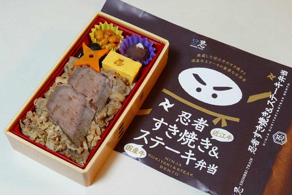 2020(令和2)年1月の京王百貨店の駅弁大会で、「忍者弁当」「忍者すき焼き弁当」とともに実演販売。茶色い掛紙には、2017(平成29)年2月発売の「忍者弁当」と同じ、忍者を思わせる構成のイラストが使われる。中身は白御飯を牛肉煮と牛ステーキで覆い、「忍」の焼き印を持つ玉子焼、手裏剣型のニンジン、しいたけ、煮豆、うばがもちを添えるもの。高価なりに肉の量があり、おいしかった。