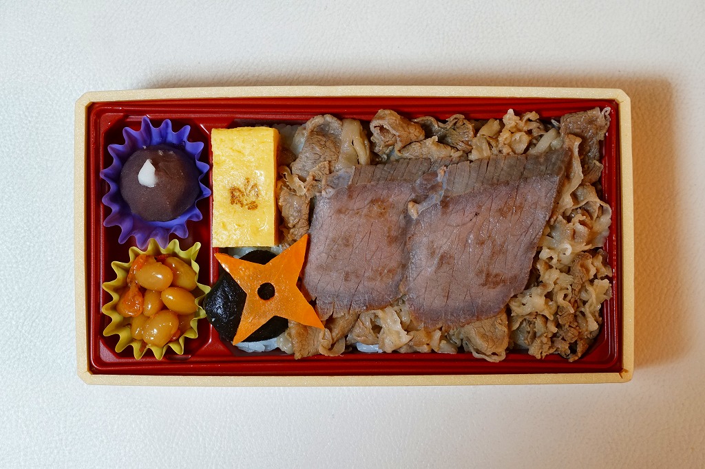2020(令和2)年12月の東武百貨店池袋店、2021(令和3)年2月の鶴屋百貨店の駅弁大会、2022(令和4)年1月の京王百貨店の駅弁大会で実演販売。催事場での実演販売の専用商品と考えられる。中身は白飯を牛ステーキと牛焼肉で覆うもの。ブロッコリーの小片とタレも添付するが、事実上肉と飯。値は張るけれど、もし駅で売られる弁当でなくても、赤身も脂身もほどほどの牛肉をたくさん食べられて、焼き立てでなくても味わえる、催事に来て満足できる商品であると思った。以後もデパートの駅弁大会での実演販売が続き、価格は2020年時点で1,800円、2023年時点で1,850円、2024年時点で1,950円、2025年時点で1,960円。